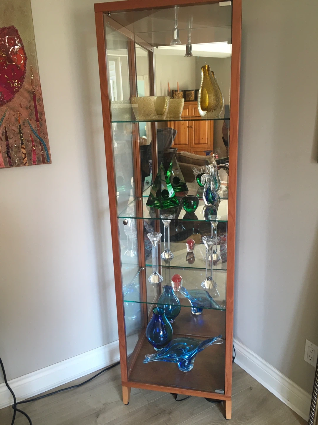 This glass display cabinet features a warm wood frame and mirrored back. It has three glass shelves and a wooden base for displaying your cherished items. Great for showcasing collectibles, glassware, or decorative pieces!
