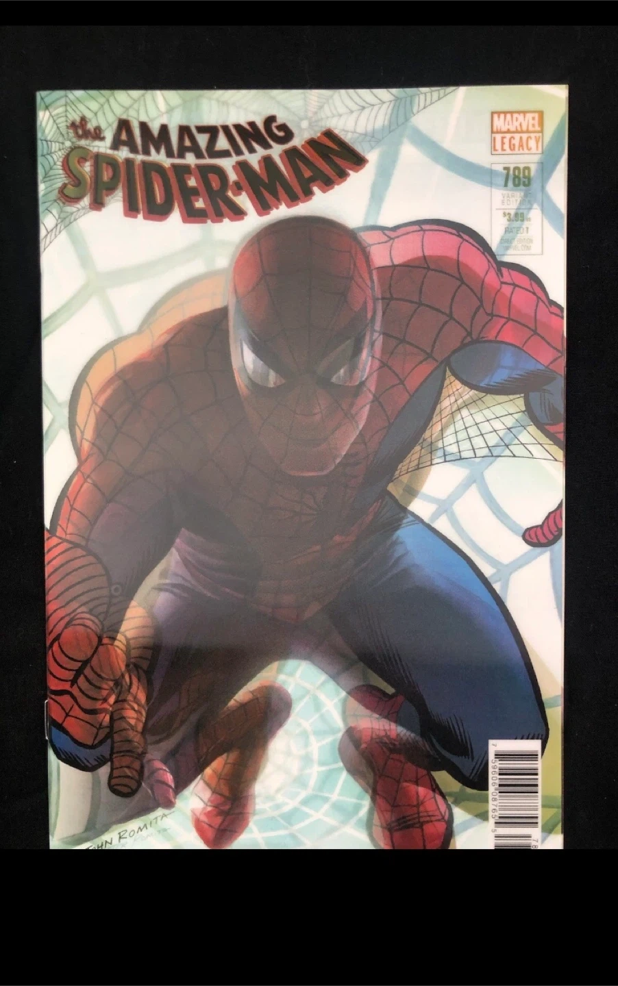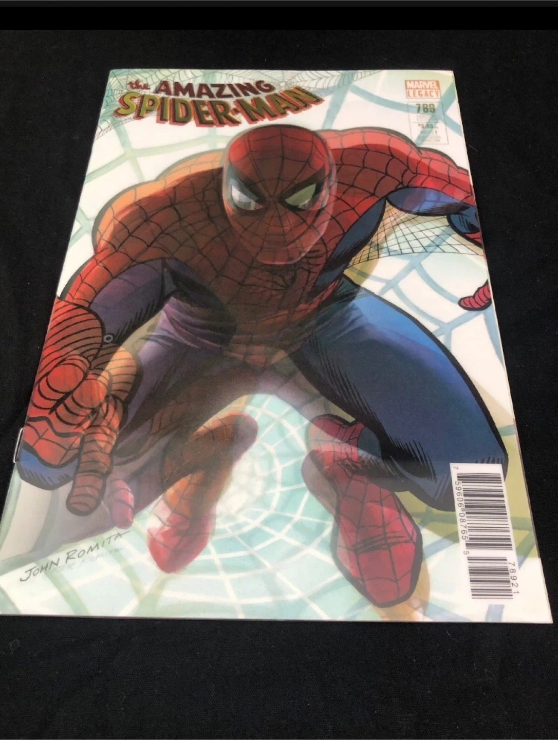 The product is a lot of four single issues of The Amazing Spider-Man comic book series, featuring a lenticular homage variant cover by artists Alex Ross and John Romita Sr. The issues (#789) were published by Marvel Comics in 2017 as part of the Modern Age era.