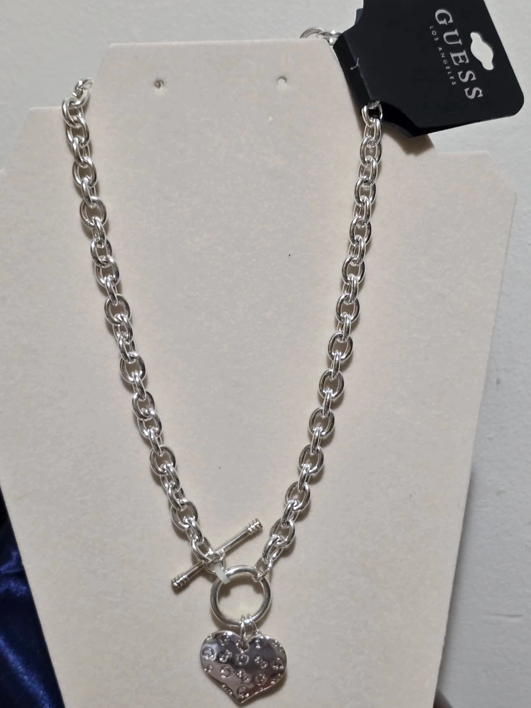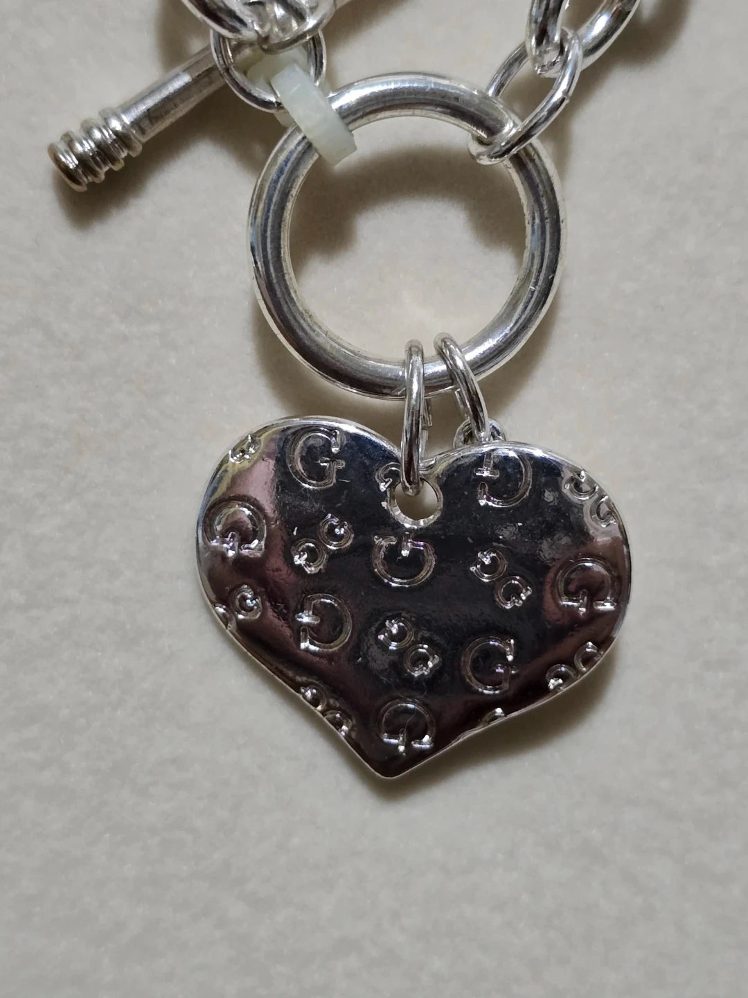 This Guess necklace features a silver tone finish with a chunky chain and a toggle clasp. It includes a heart-shaped charm with embossed "G" logos and a textured pattern. The necklace comes with its original tag attached. Perfect for adding a statement piece to any outfit!