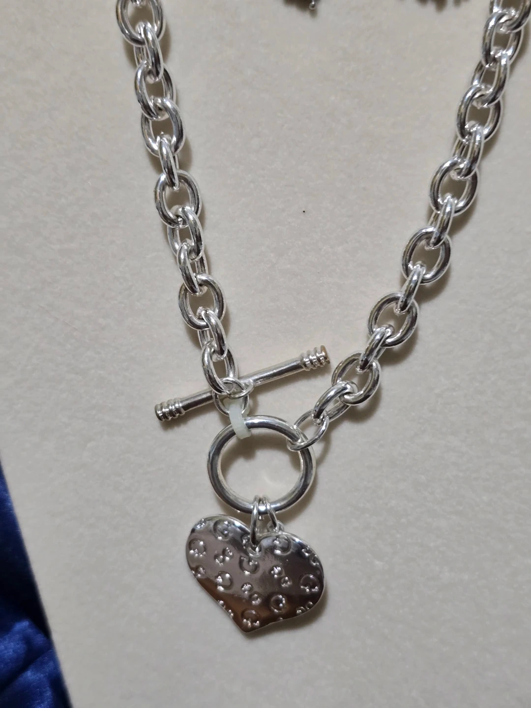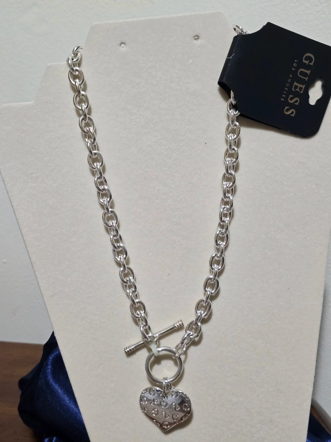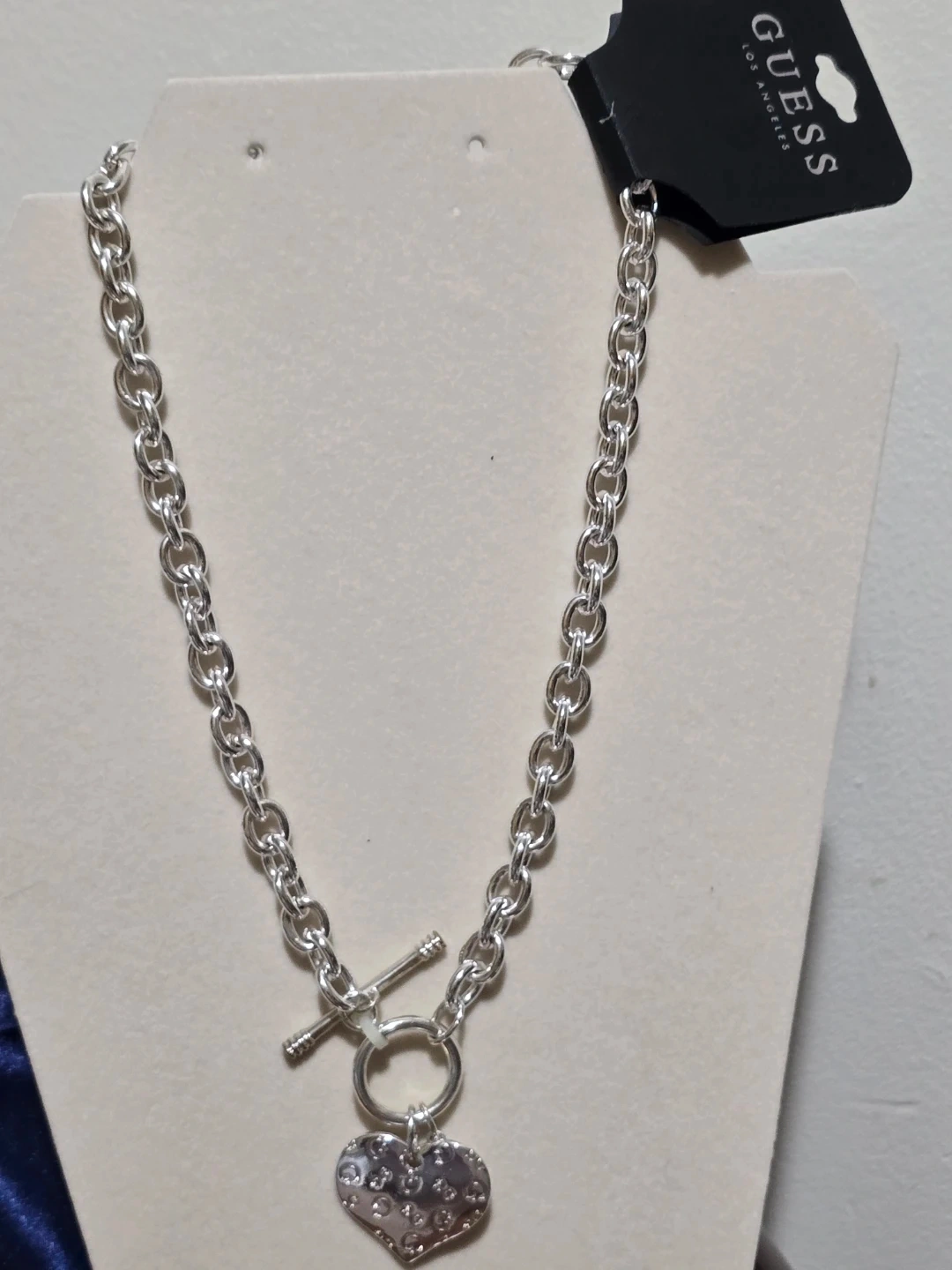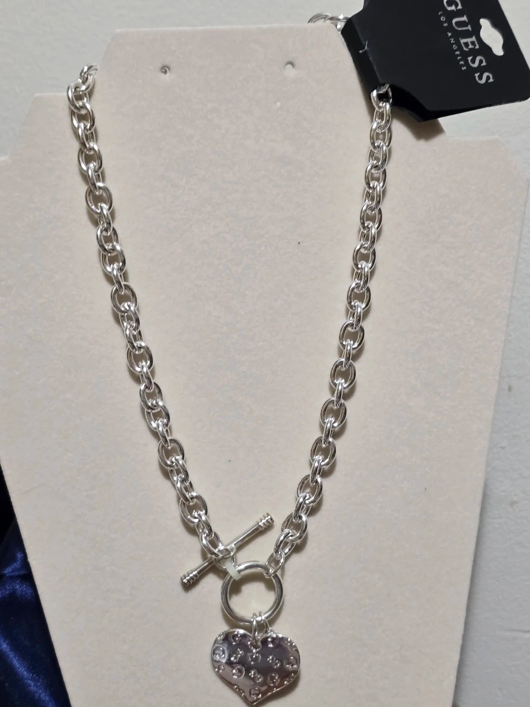 This Guess necklace features a silver tone finish with a chunky chain and a toggle clasp. It includes a heart-shaped charm with embossed "G" logos and a textured pattern. The necklace comes with its original tag attached. Perfect for adding a statement piece to any outfit!