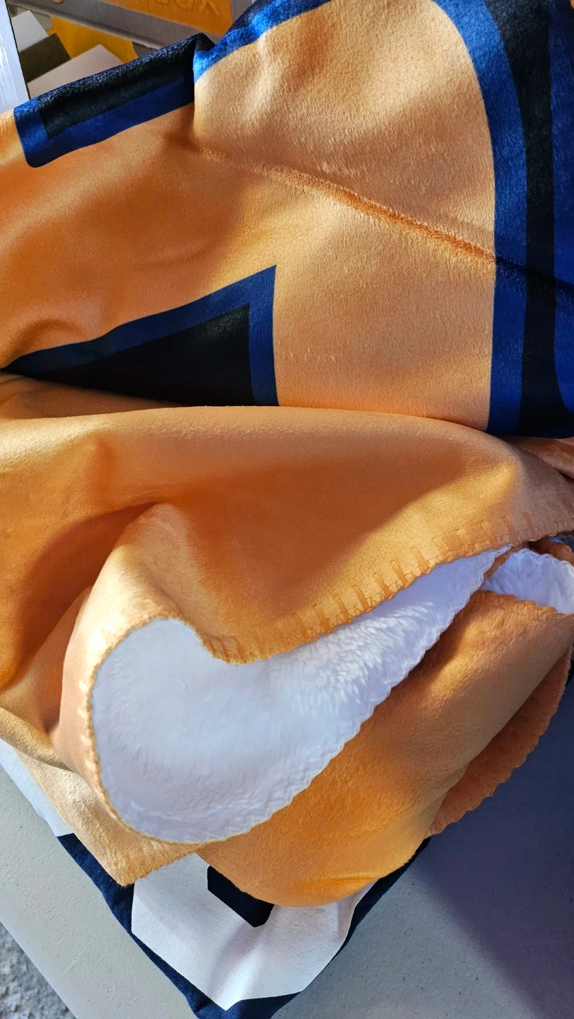 This cozy throw blanket features a soft plush material on one side and a fluffy sherpa lining on the other. It has a bold orange background with blue and black geometric designs. It's great for staying warm on chilly evenings!