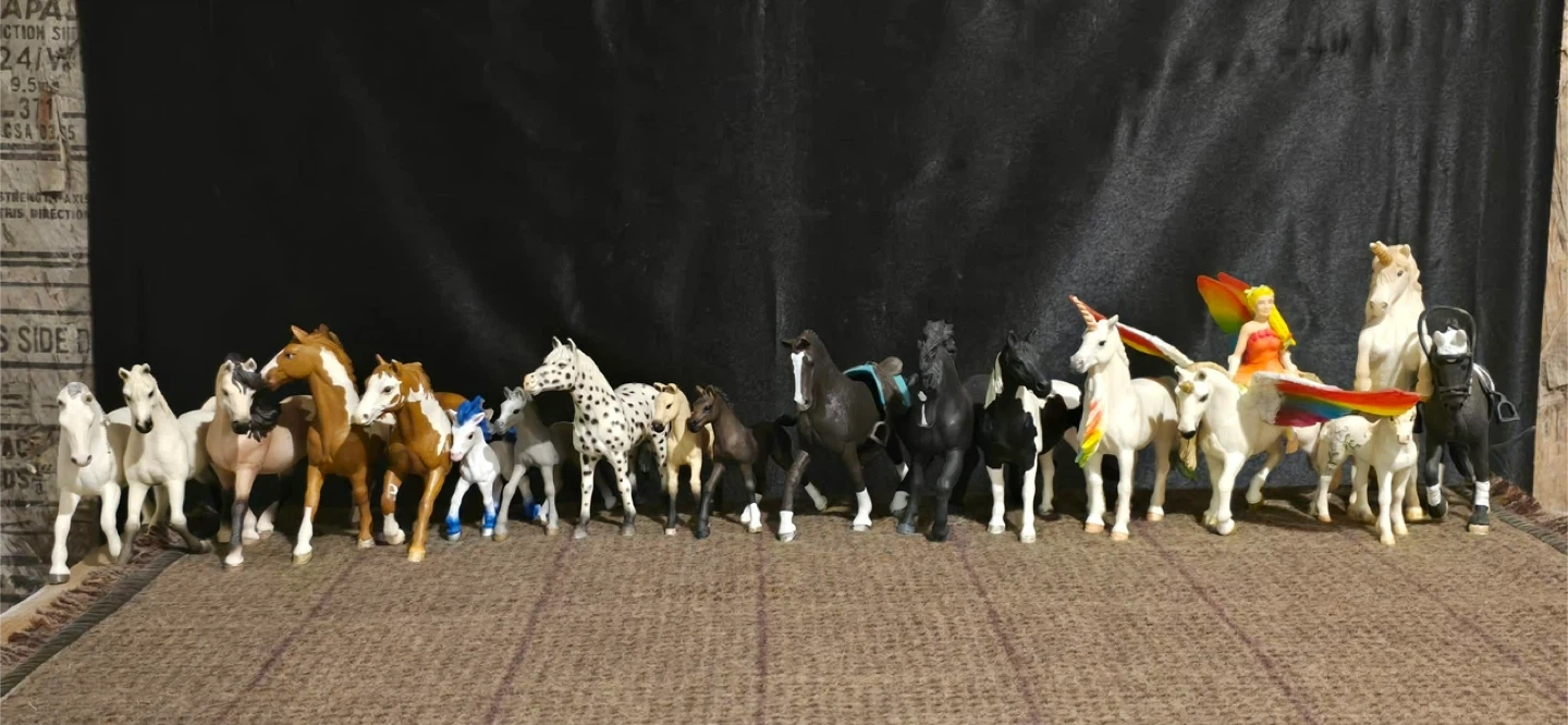 A diverse collection of 48 animal figurines, including horses, unicorns, dogs, horses, parrots, and various wild animals. These are pre-owned toys in perfect condition. They're suitable for imaginative play or display. some are vintage