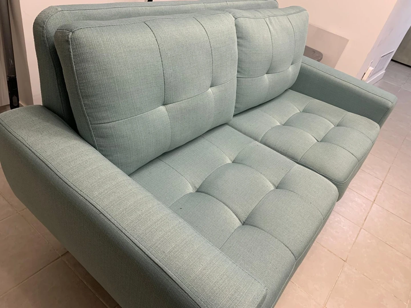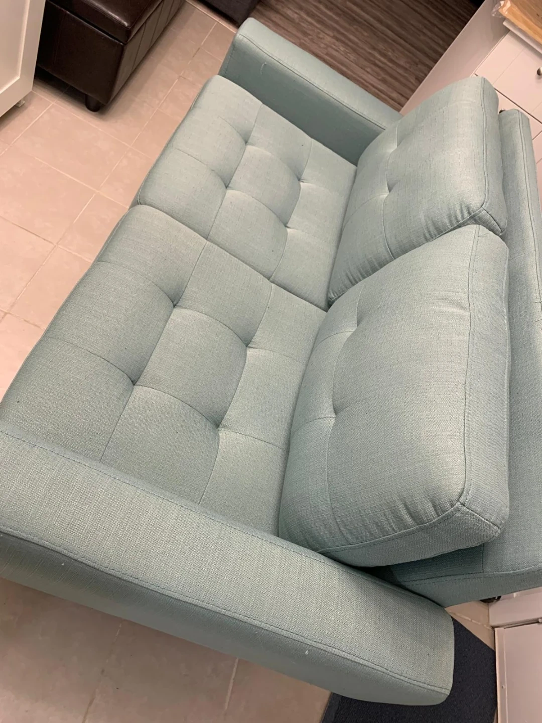 This light blue loveseat features a modern tufted design. It's upholstered in a durable fabric. The sofa has wooden legs. Perfect for small spaces!