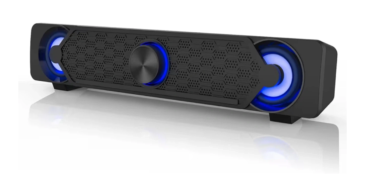 This Hpyilif-A soundbar features powerful audio and 7-colour LED lighting with a light display. It's great for enhancing your computer or gaming setup with both sound and visuals. Volume control is conveniently located on the top.