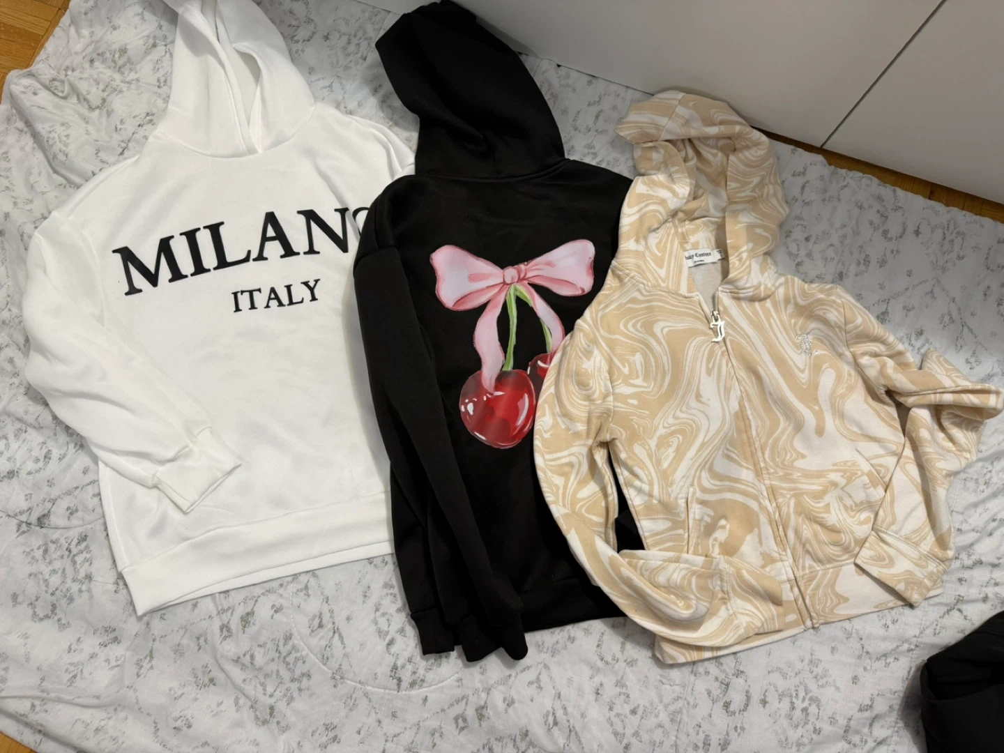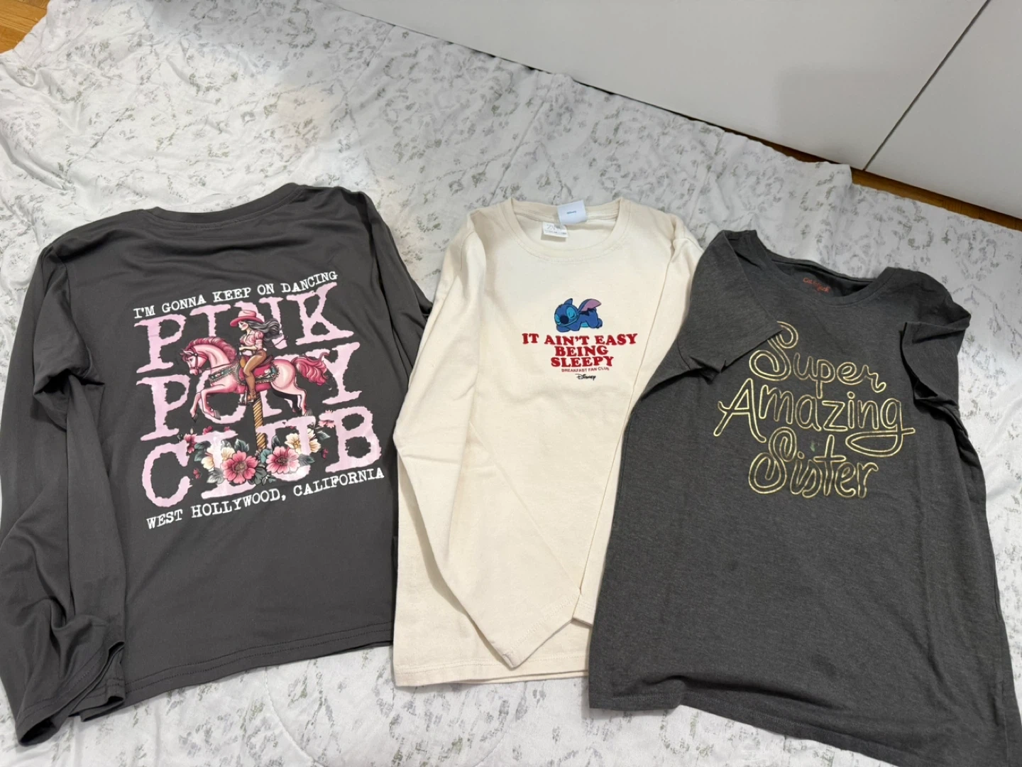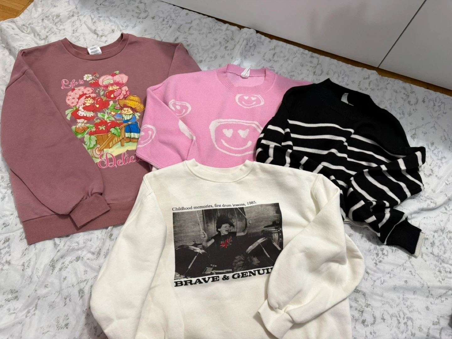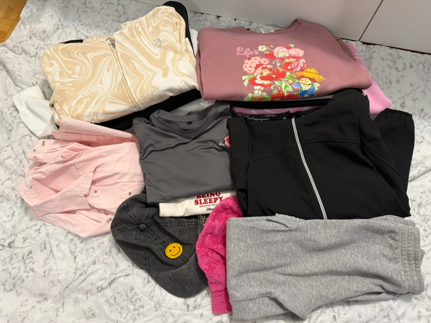 Bundle includes a variety of tops and outerwear items. Features graphic tees, a zip-up hoodie, a pink button-up shirt with embellishments, and a pink graphic sweatshirt. Styles include character graphics, text prints, and abstract patterns. All in good condition 🤗