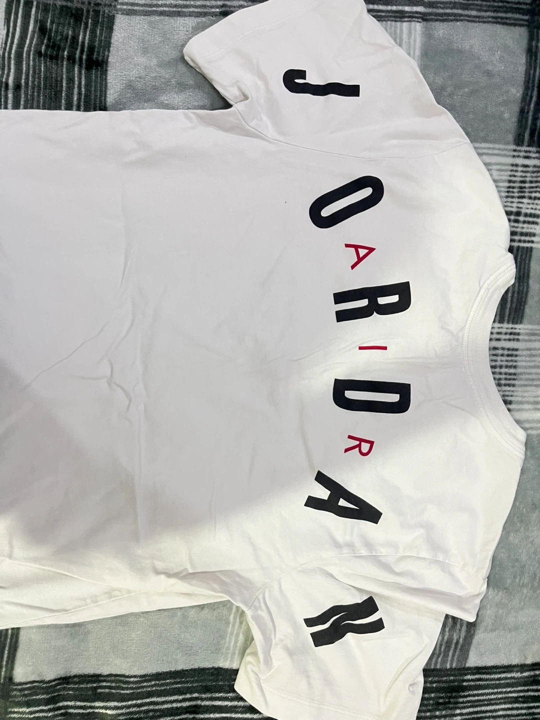 Selling a Jordan white t-shirt. It has the Jordan logo on the front. It's in good condition and ready for a new home.