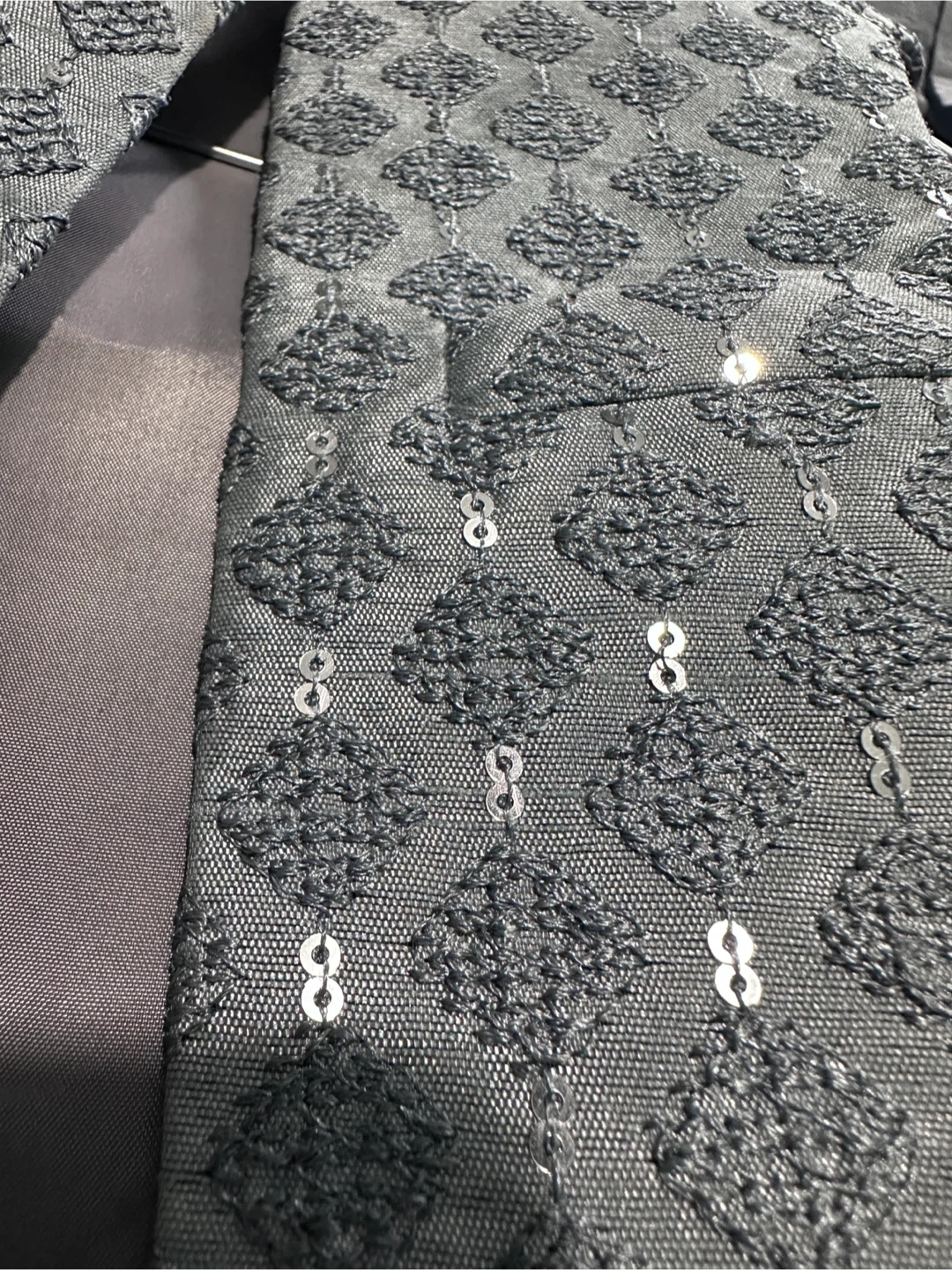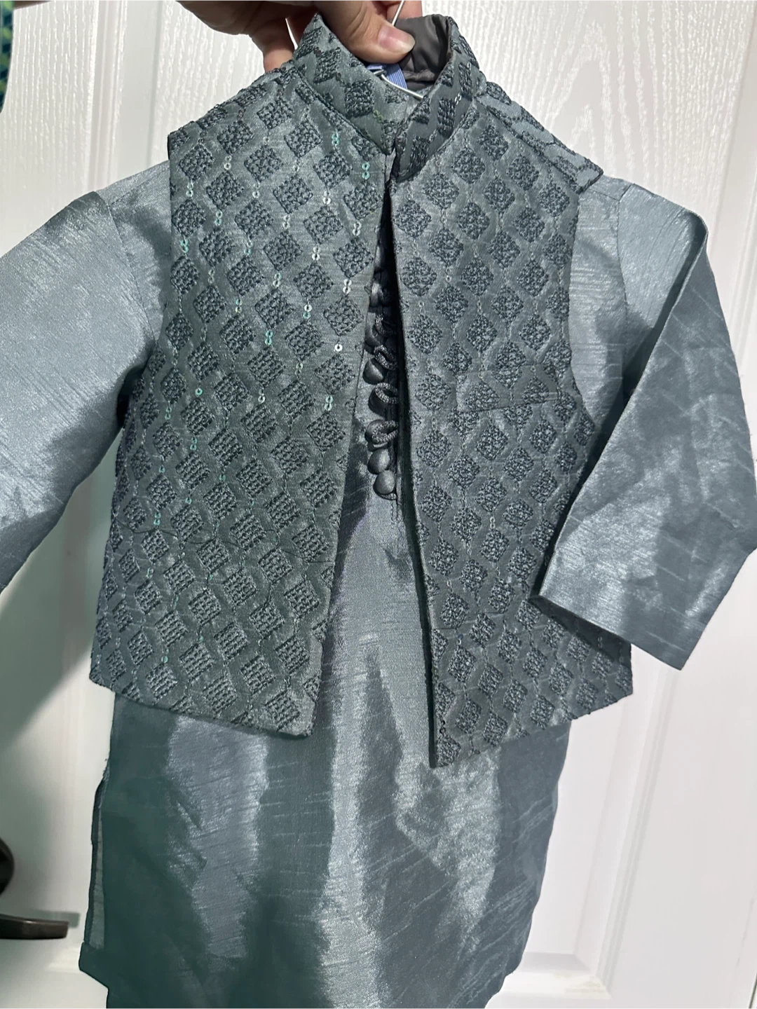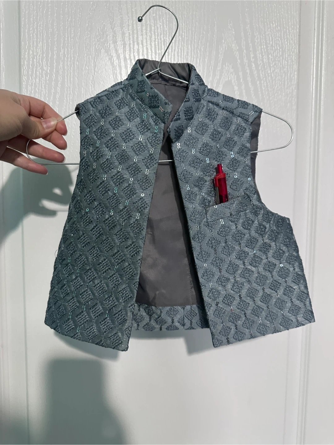 Boys kurta and vest set in grey colour. The vest features a diamond pattern with sequin embellishments. It's great for special occasions or festive events!