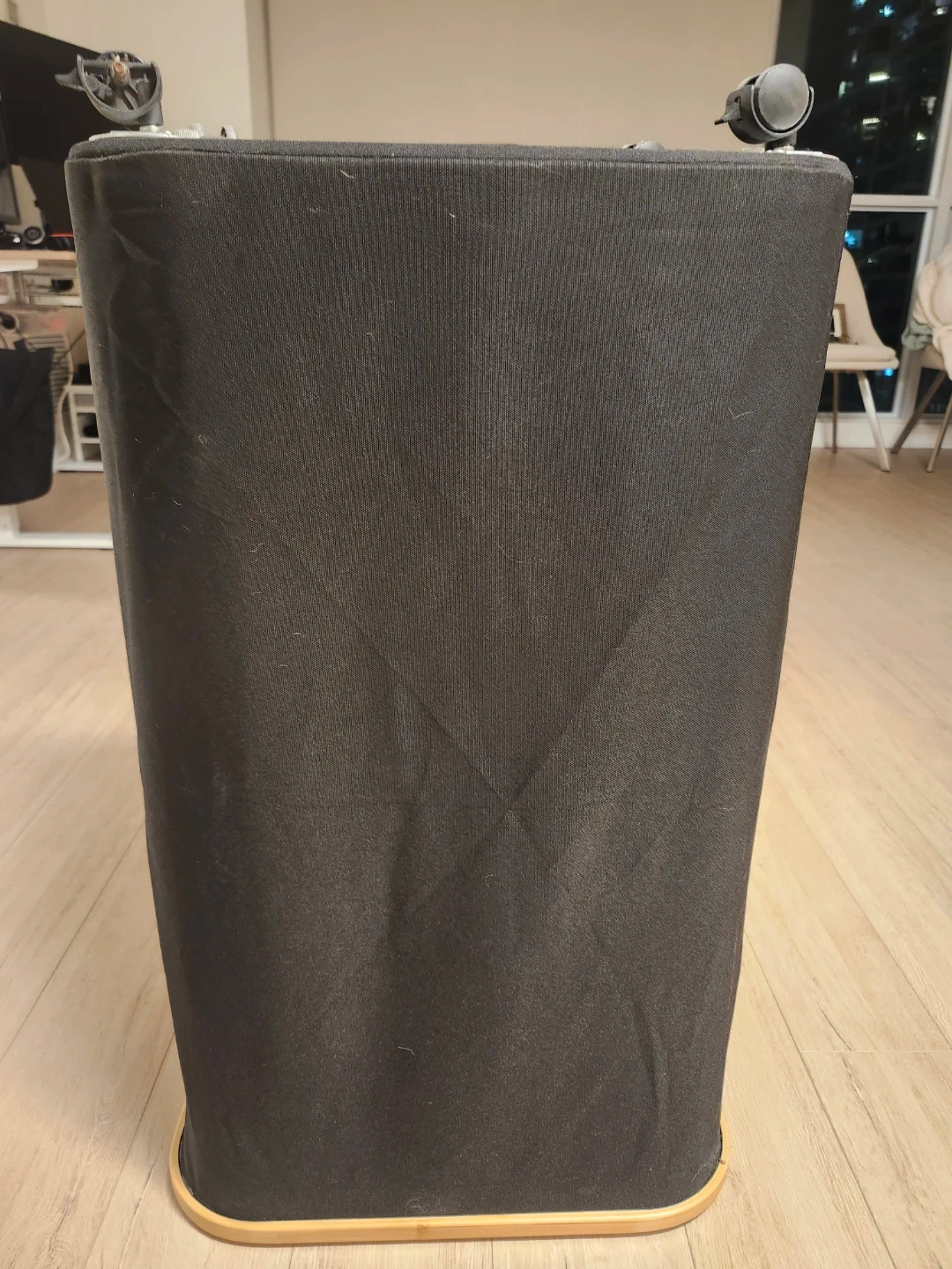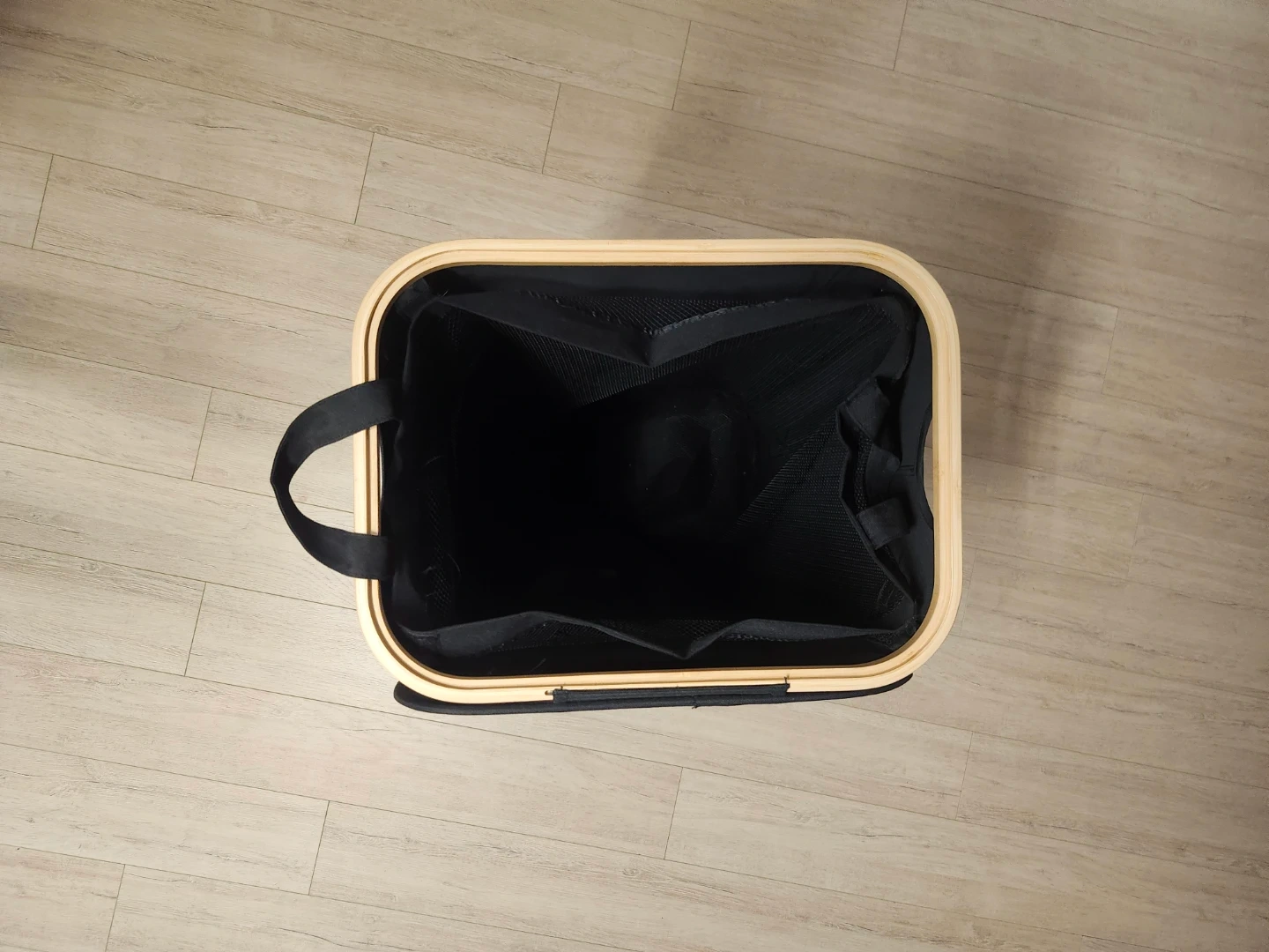 β’ Rectangular black fabric hamper with natural bamboo/wood top rim