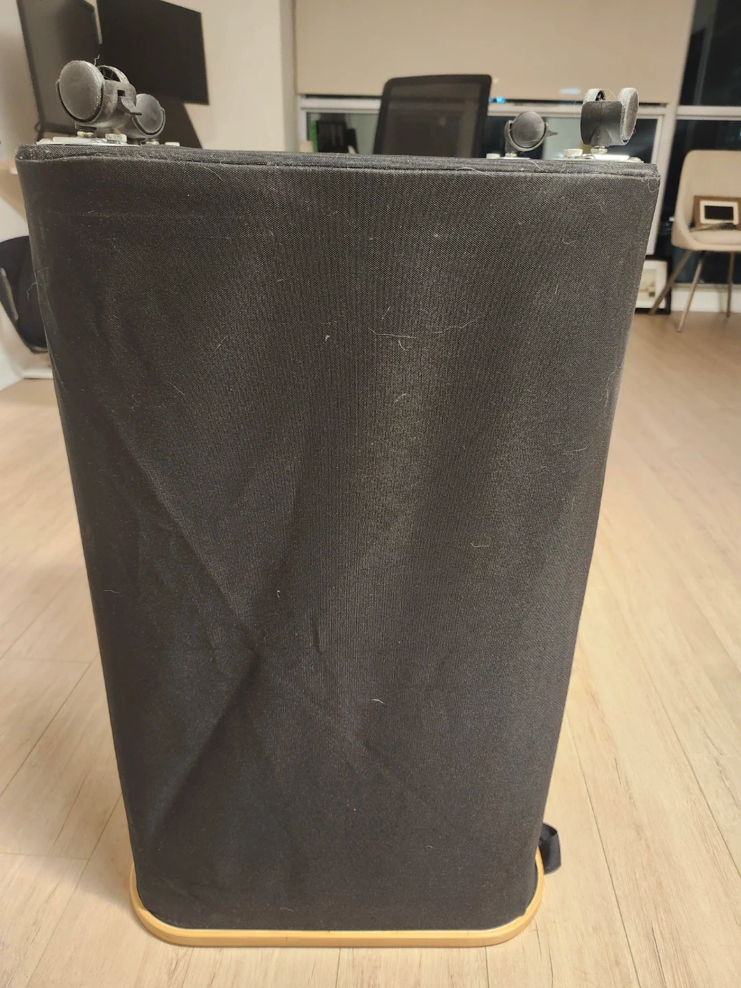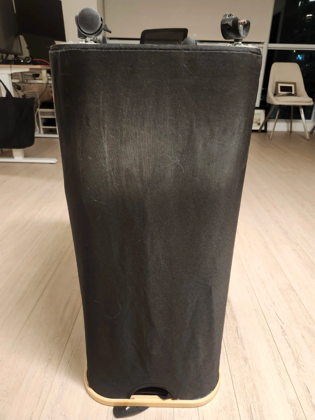 Fully functional. Fabric shows normal wear β some lint and light wrinkles from regular use. No structural damage. One of the wheels has slight damage but all wheels roll smoothly.
