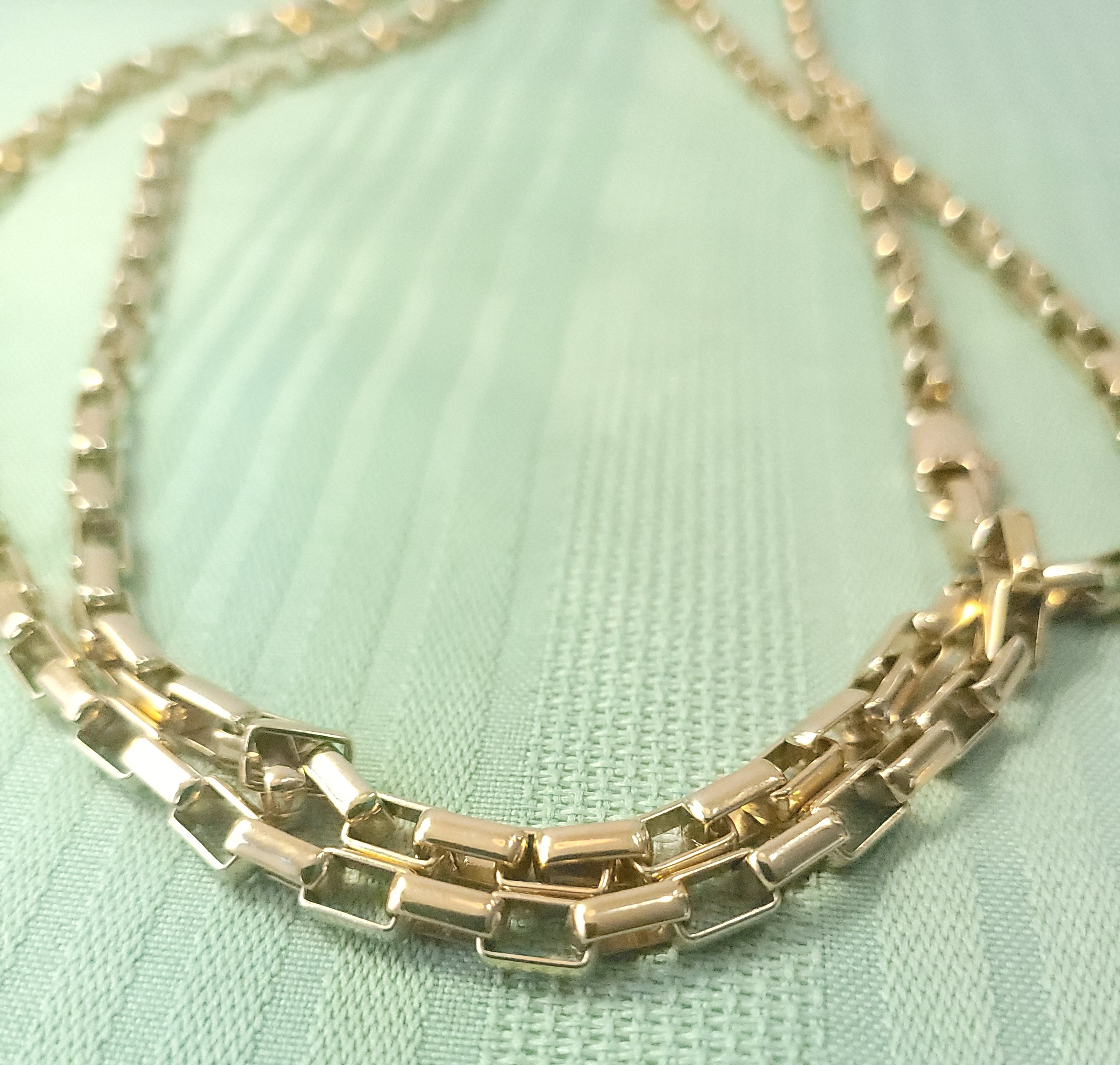 This is a substantial and high-quality vintage Venetian box chain necklace, likely of Italian origin. Featuring a rich, deep gold-toned finish, this necklace has a heavy, luxurious drape and a professional lobster claw clasp. At 47.5 inches, it is long enough to be doubled or tripled, making it a perfect staple for layering or a bold 80s-inspired statement.