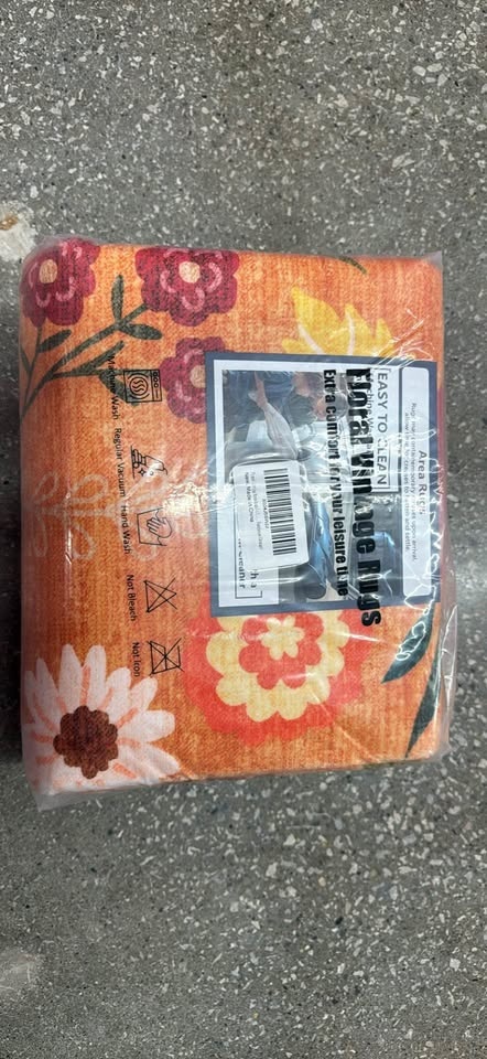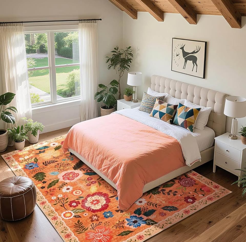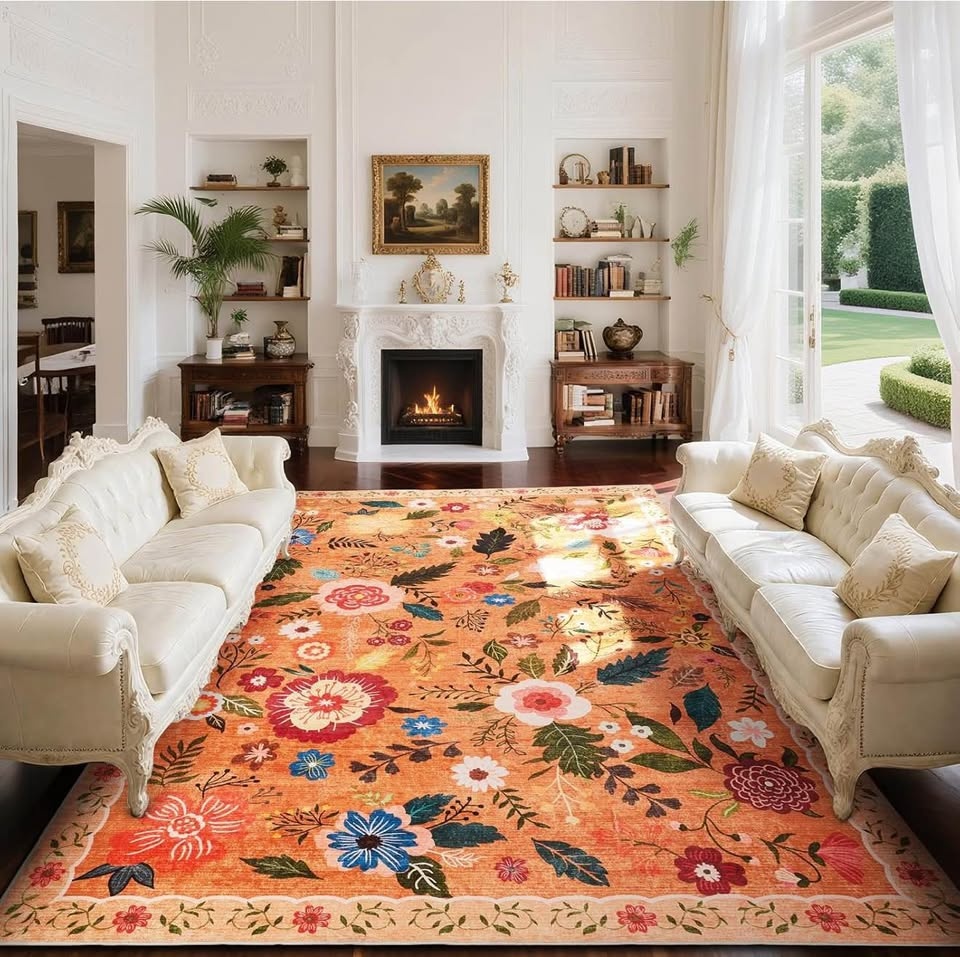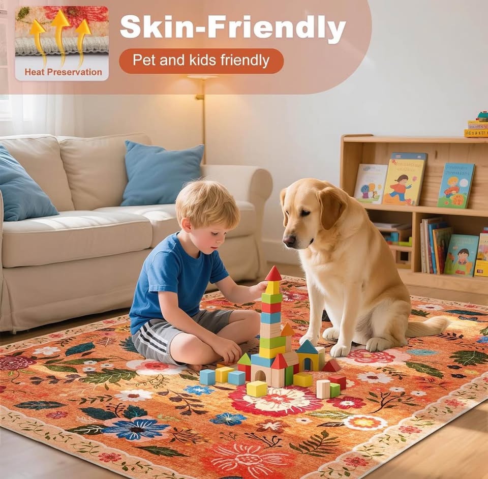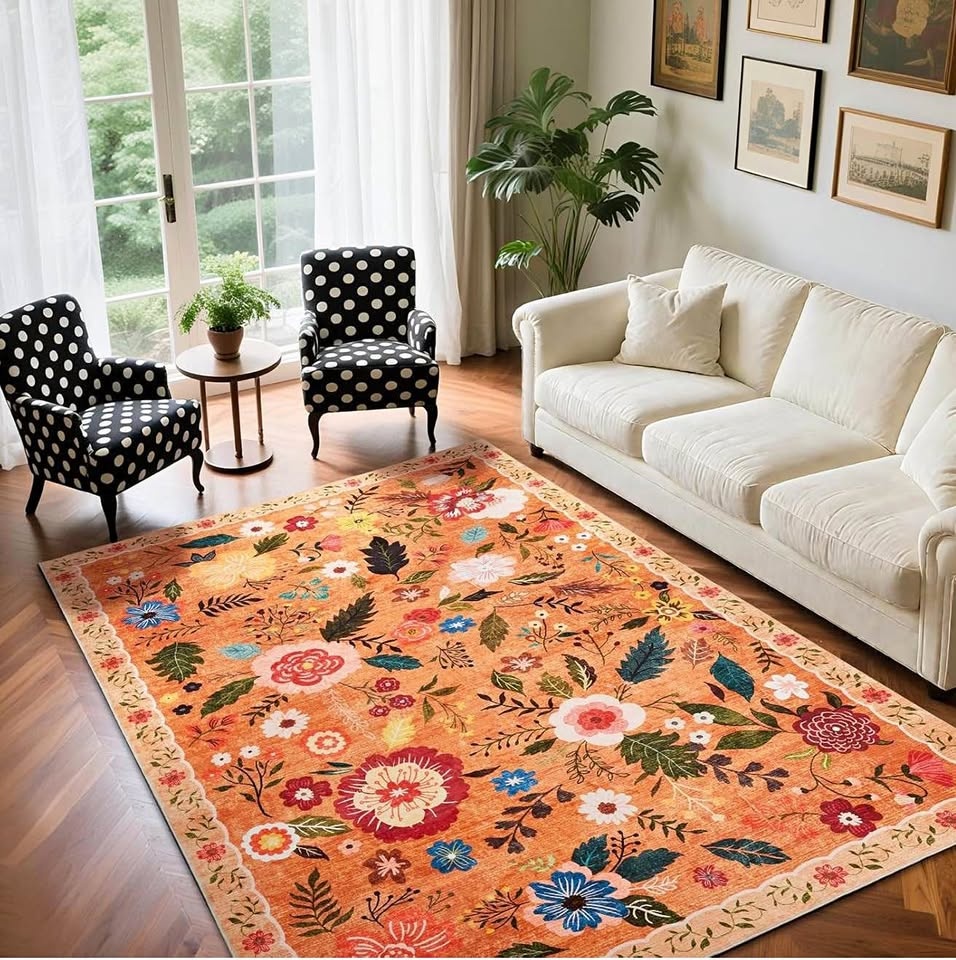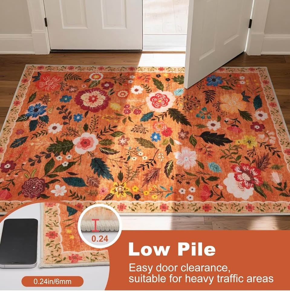 Brand new Area Rugs 5x7 for Living Room, Washable Floral Rug for Bedrooms, Low-Pile Non-Slip Soft Boho Large Carpet for Classroom, Dining Room, Office, Kids Playroom, Orange