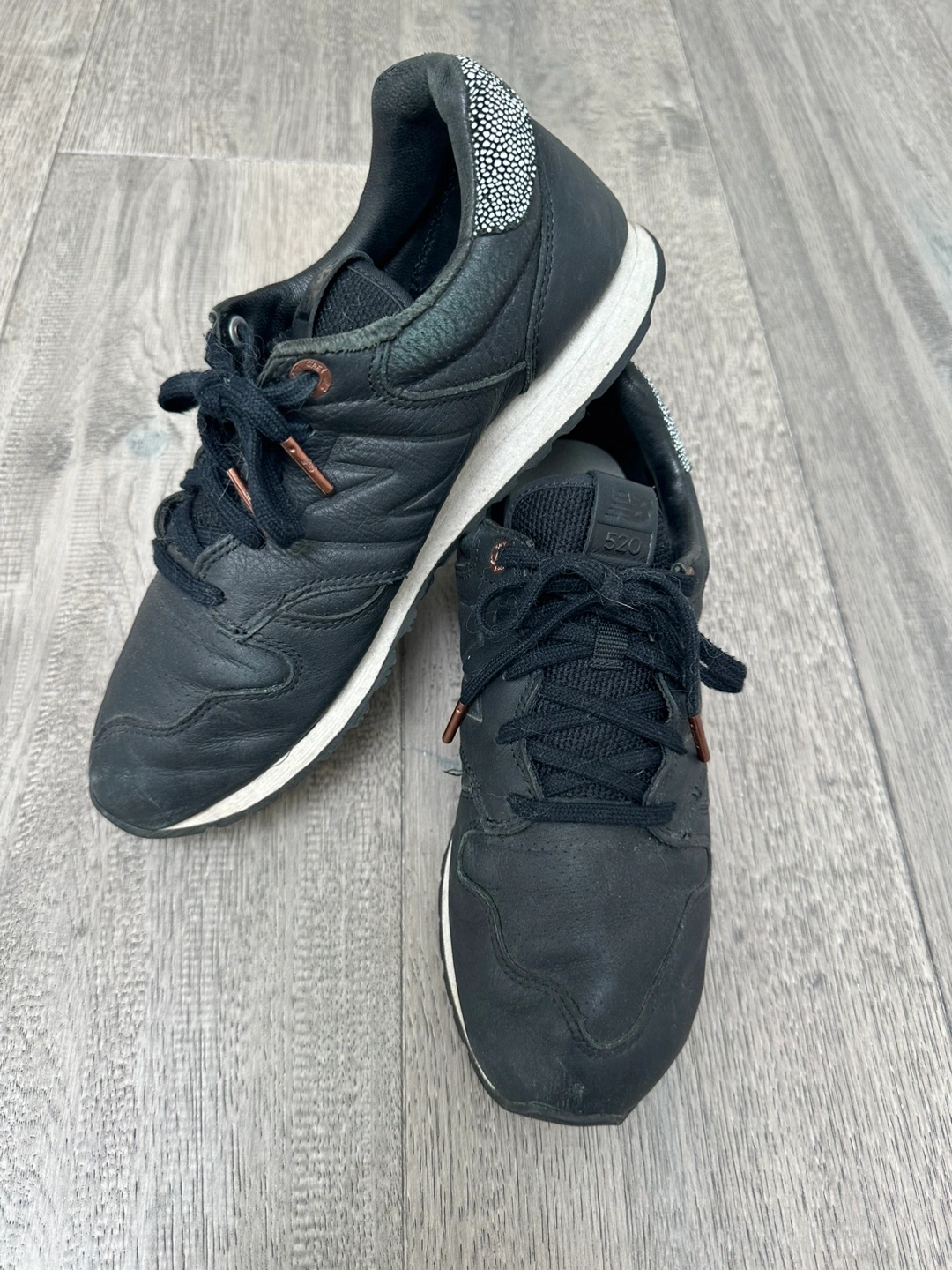 Selling a pair of New Balance 520 sneakers in black. Some wear and tear but still have life in them. They have a stylish look and are great for everyday wear.