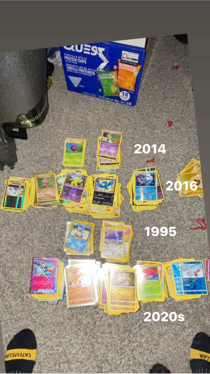 A diverse collection of Pokémon trading cards spanning several decades. Includes cards from 1995, 2014, 2016, and the 2020s. Great for collectors or new players alike! A ton of it as well I can send a vid of the sides to show how many cards there truly are.