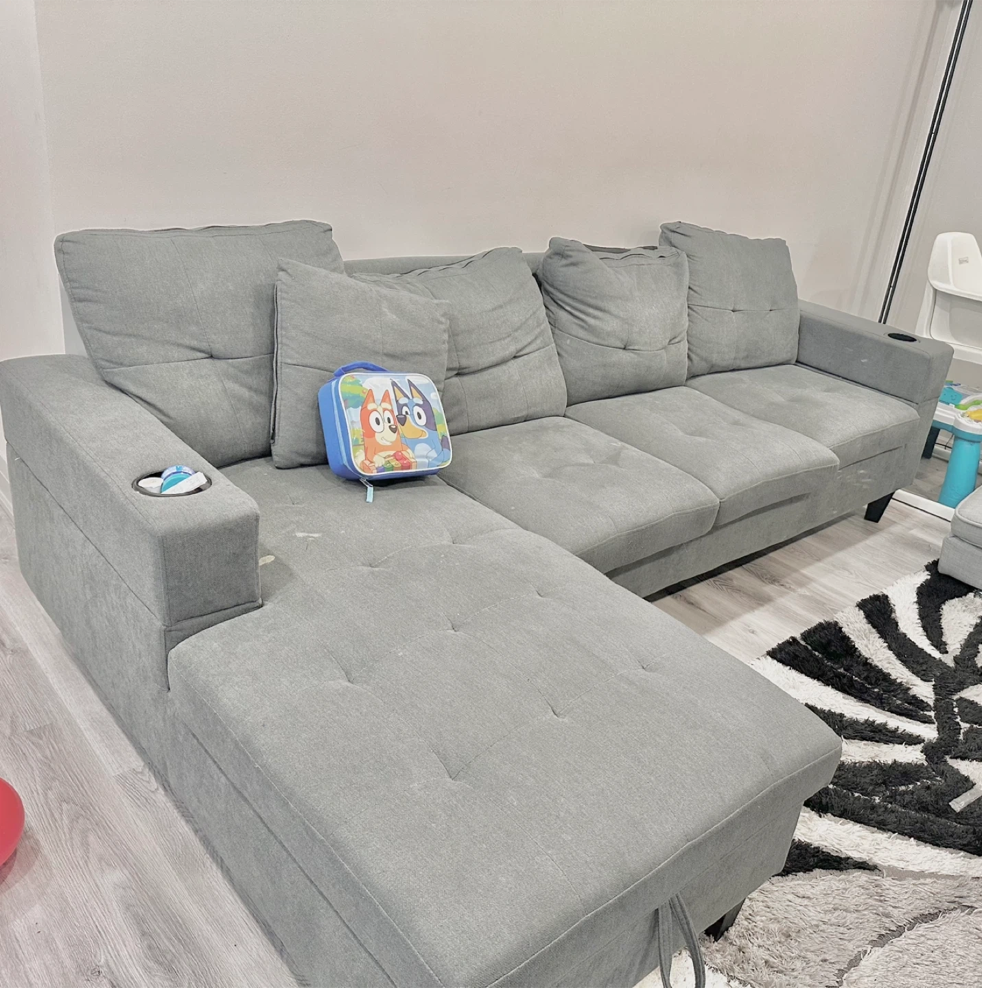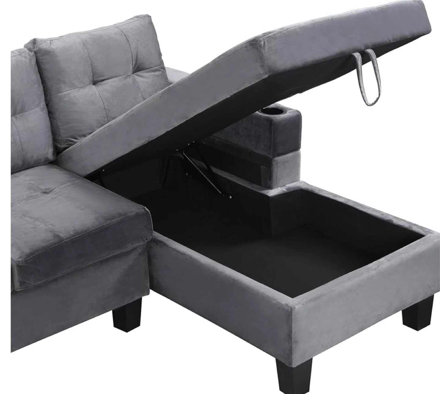 This sectional sofa comes in a stylish grey fabric. It features a chaise with built-in storage, perfect for stashing away blankets or pillows. Two cup holders are integrated into the armrests for convenience. It's great for movie nights or relaxing with family!