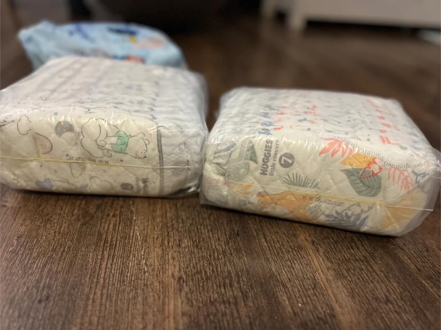 I have two packs of Huggies Little Movers diapers, size 7. One pack features a Winnie the Pooh design, and the other has a jungle theme. Perfect for your little one!