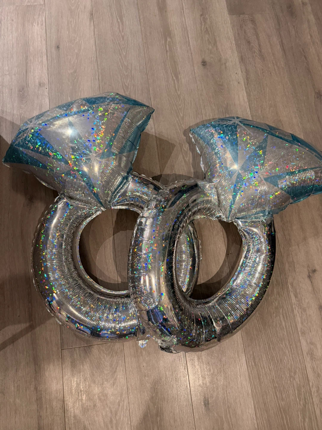Set of two diamond ring shaped mylar balloons. These are silver and blue with a holographic sparkle finish. Great for engagement parties or bridal showers! Free!