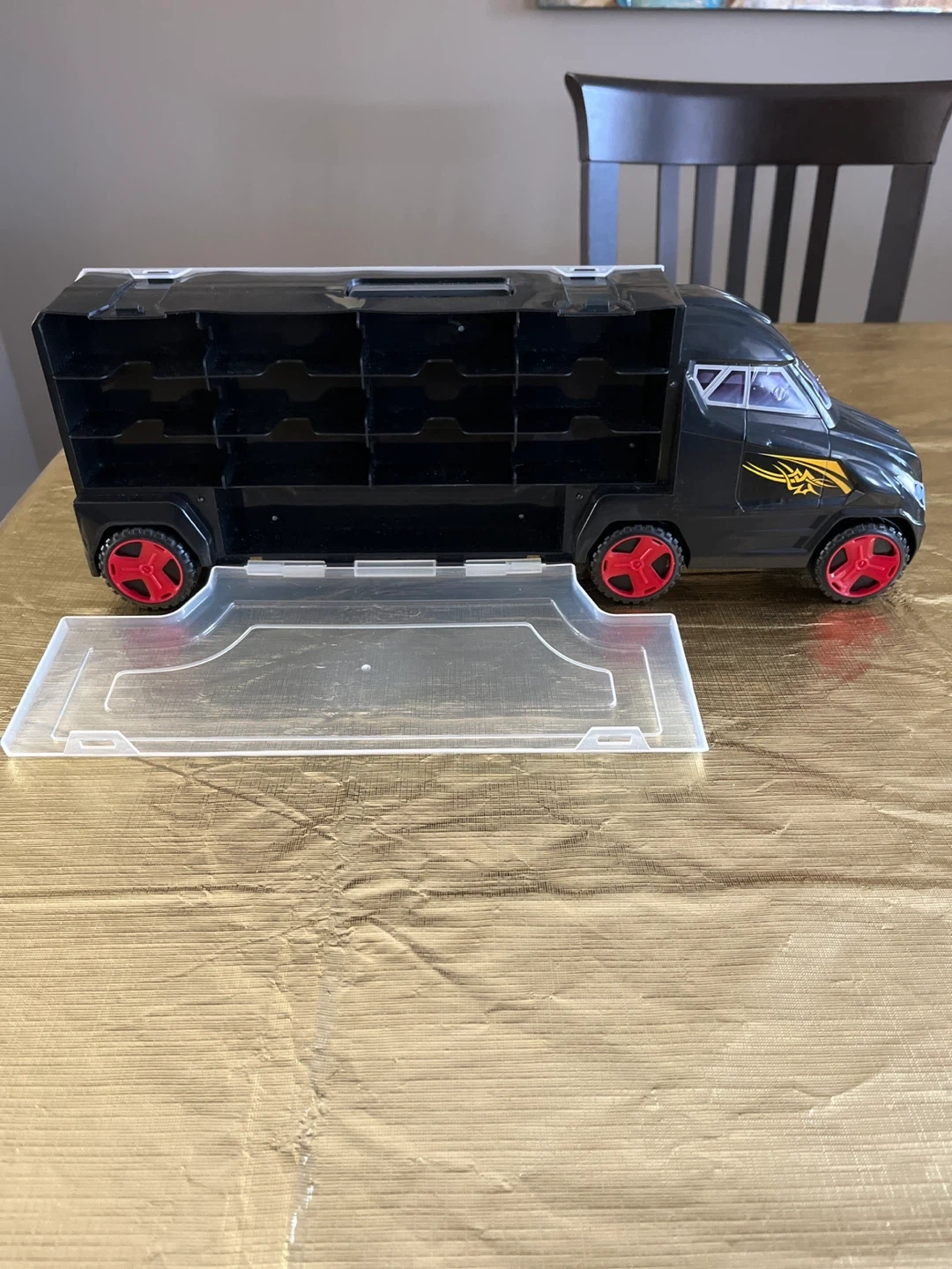 This black toy truck features a storage case with multiple compartments. It's designed to hold small toy vehicles and comes with a clear pull-out tray. Includes a handle for easy carrying!