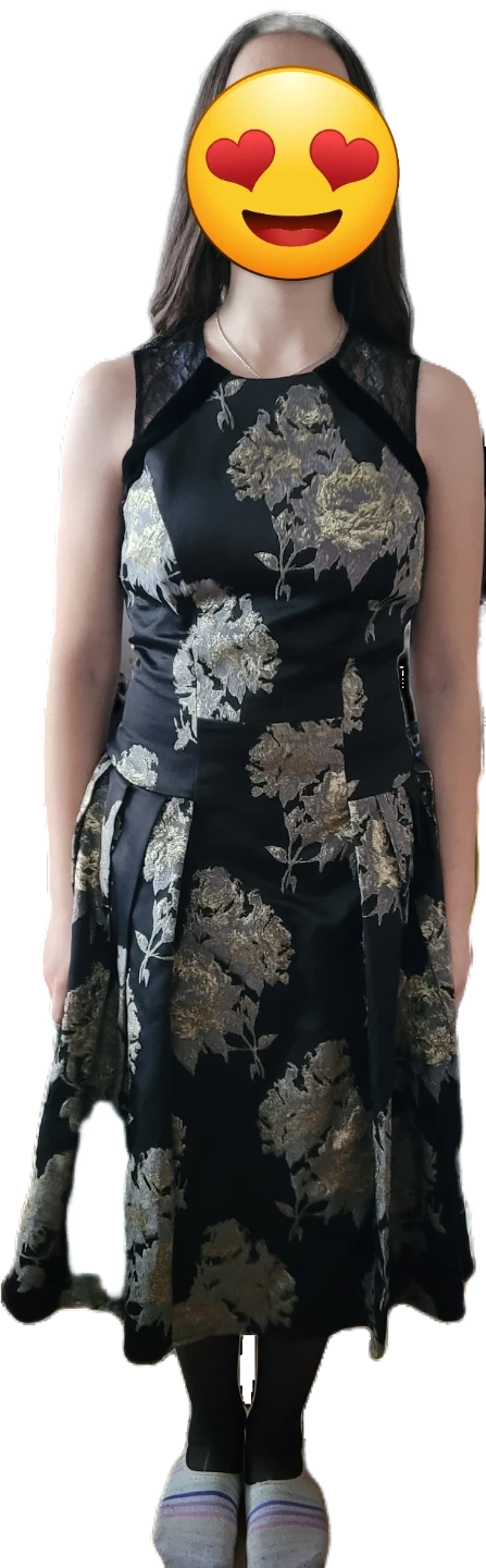 Black sleeveless dress by Carmen Marc Valvo with a striking gold floral jacquard pattern. It's a size 2. This dress is perfect for a special occasion or evening out!