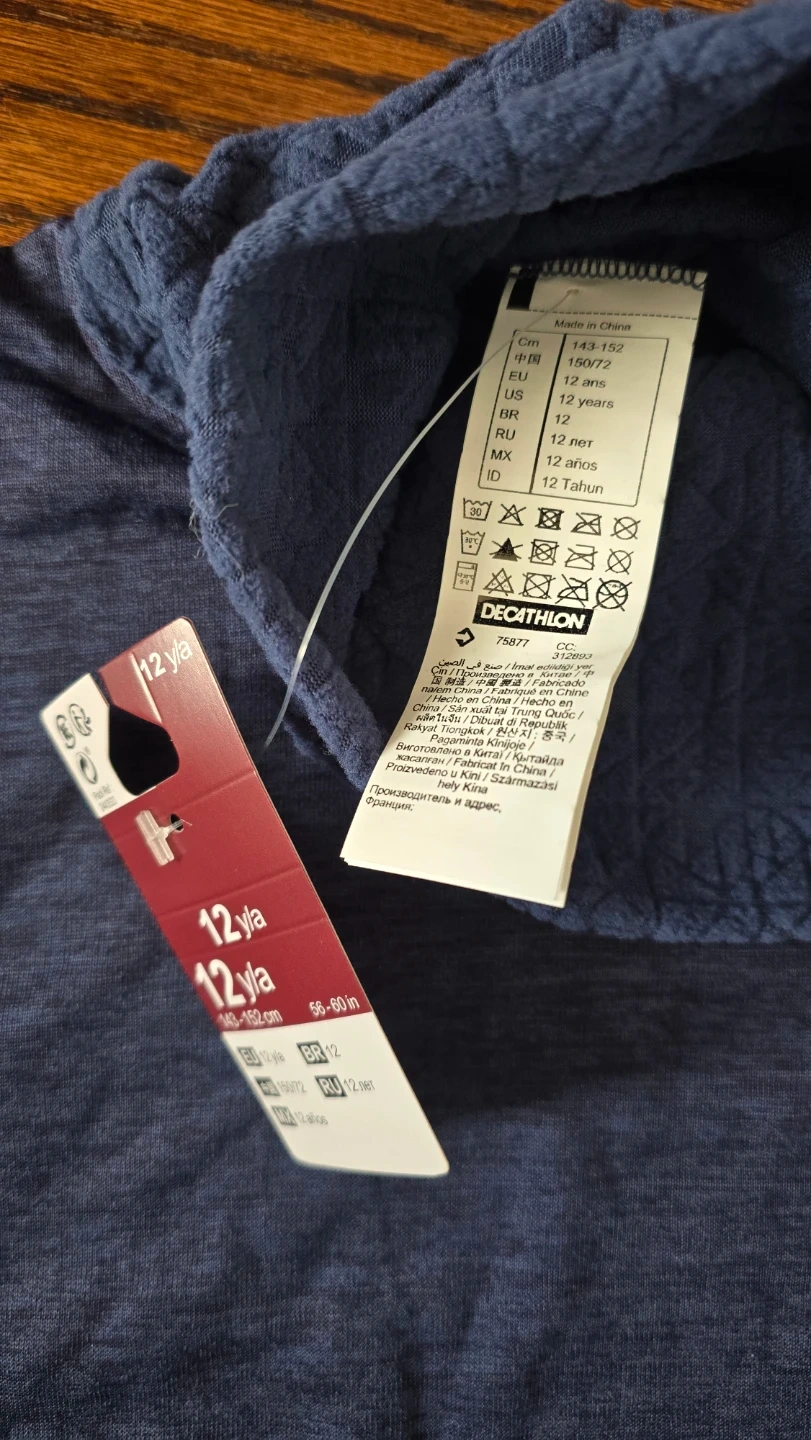 NEW Blue turtleneck long-sleeve top from Decathlon's Quechua line. Size 12 years, suitable for heights 143-152 cm. Made with a textured fabric for comfort.