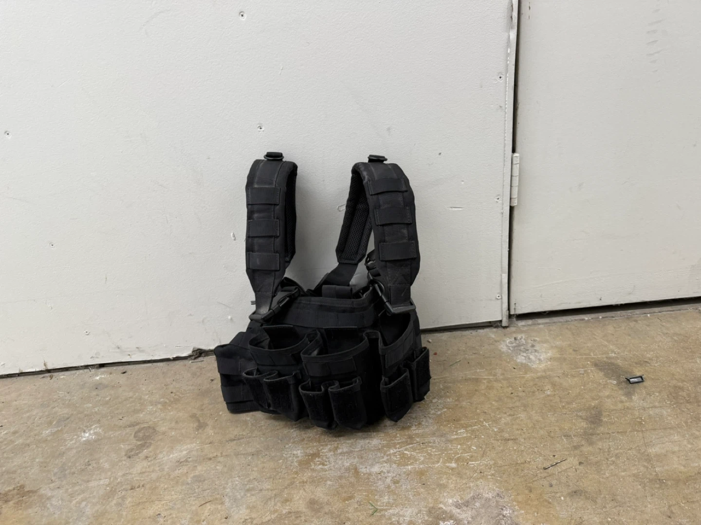 This black tactical chest rig offers multiple pouches for storage. It's made from durable material and features adjustable straps. This rig is useful for organizing gear for outdoor activities.