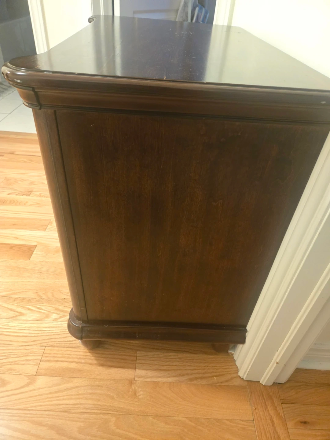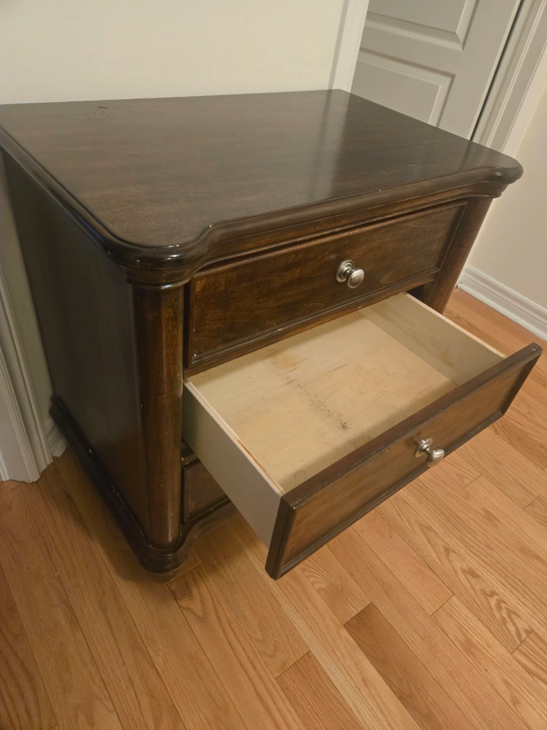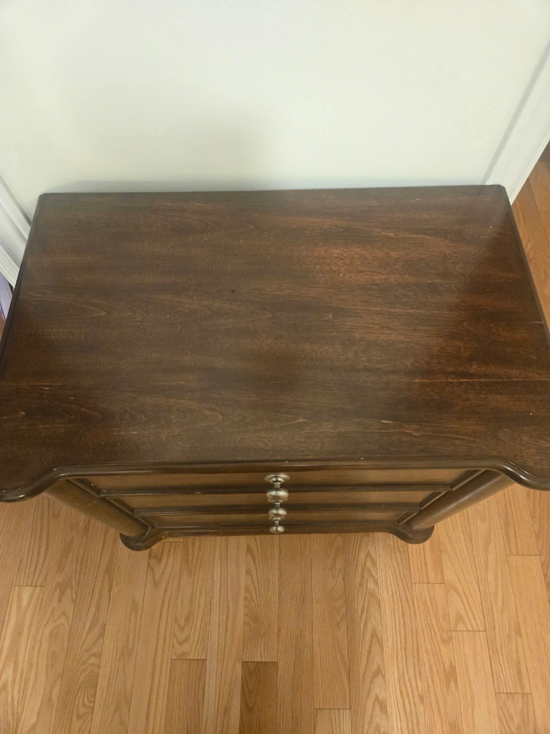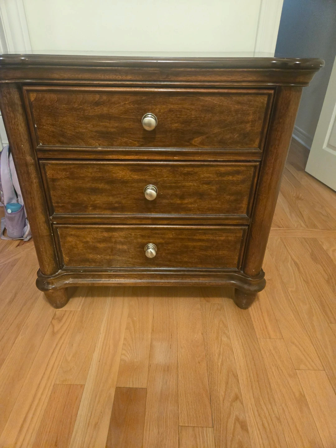 Here's a lovely brown wood nightstand with three drawers! It's perfect for keeping your bedside essentials close at hand. The nightstand is in good condition and ready to add a touch of charm to your bedroom
