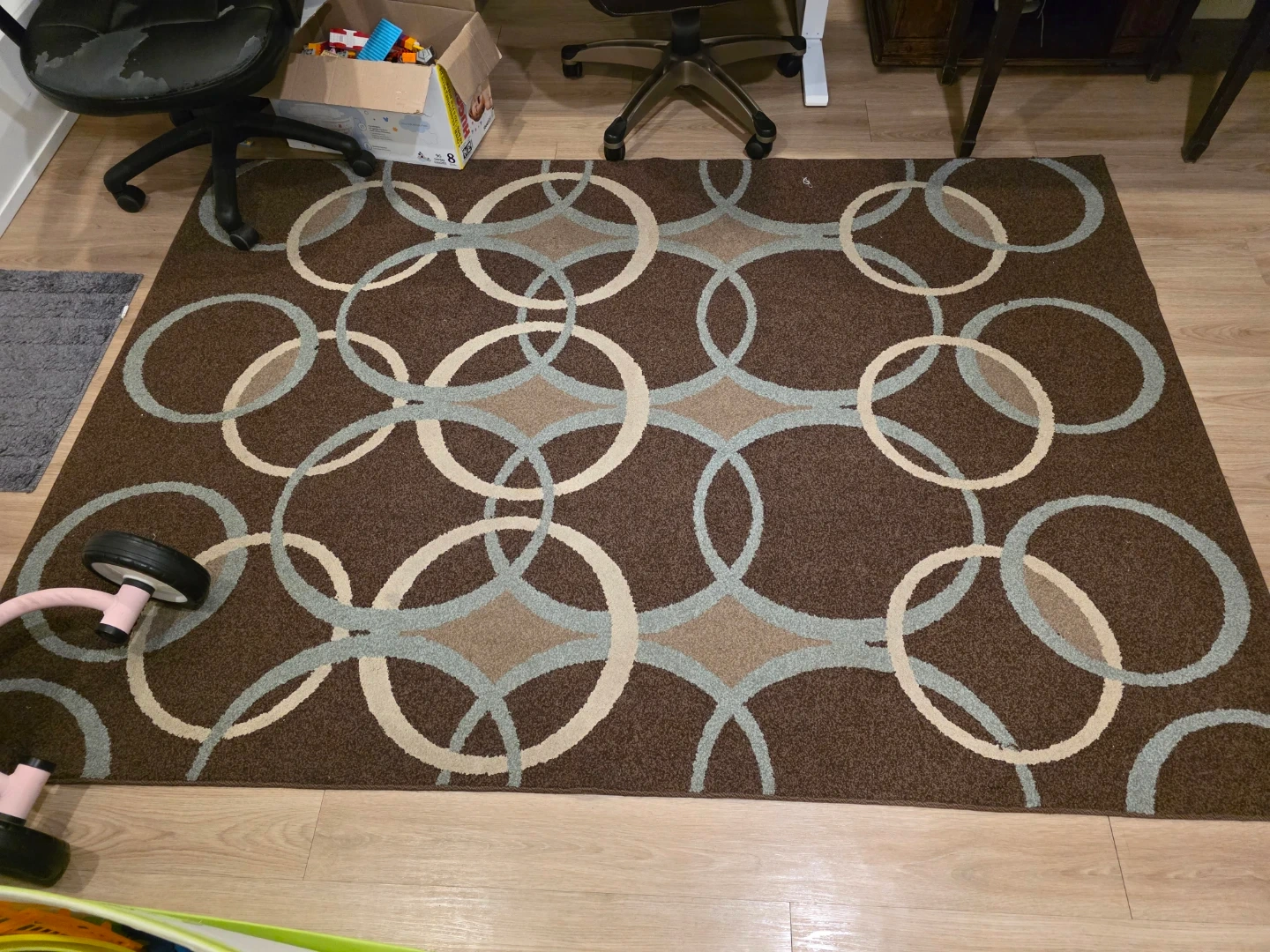 Selling a gently used area rug with a brown geometric pattern. It's in good condition and would look great in any living room or bedroom!