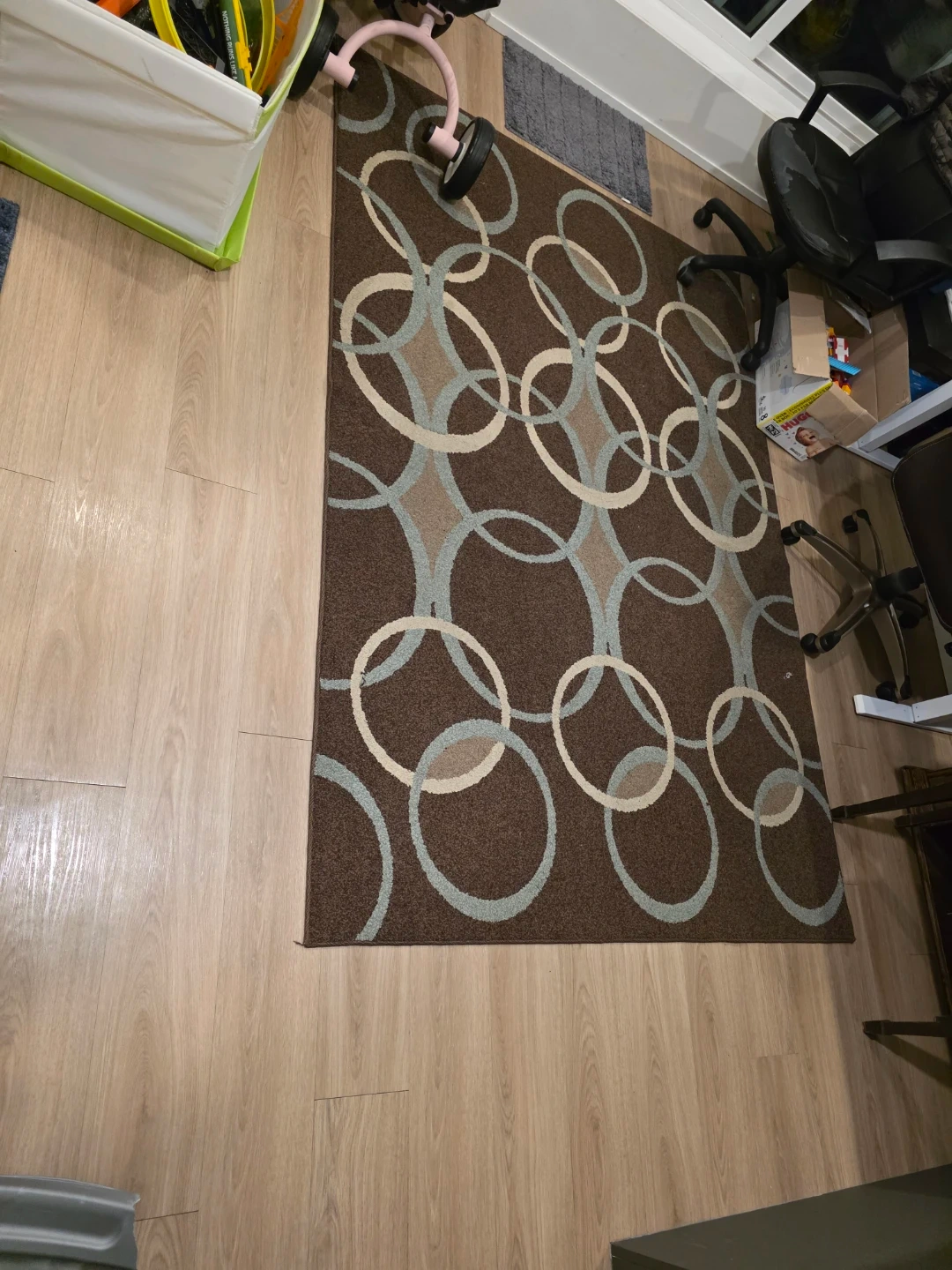 Selling a gently used area rug with a brown geometric pattern. It's in good condition and would look great in any living room or bedroom!