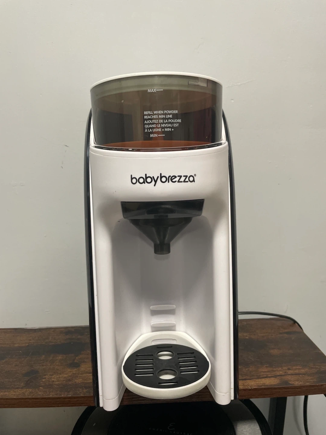 This is a Baby Brezza automatic formula dispenser. It's white and black and measures liquid in ml/oz. Refill the powder when it reaches the min line.