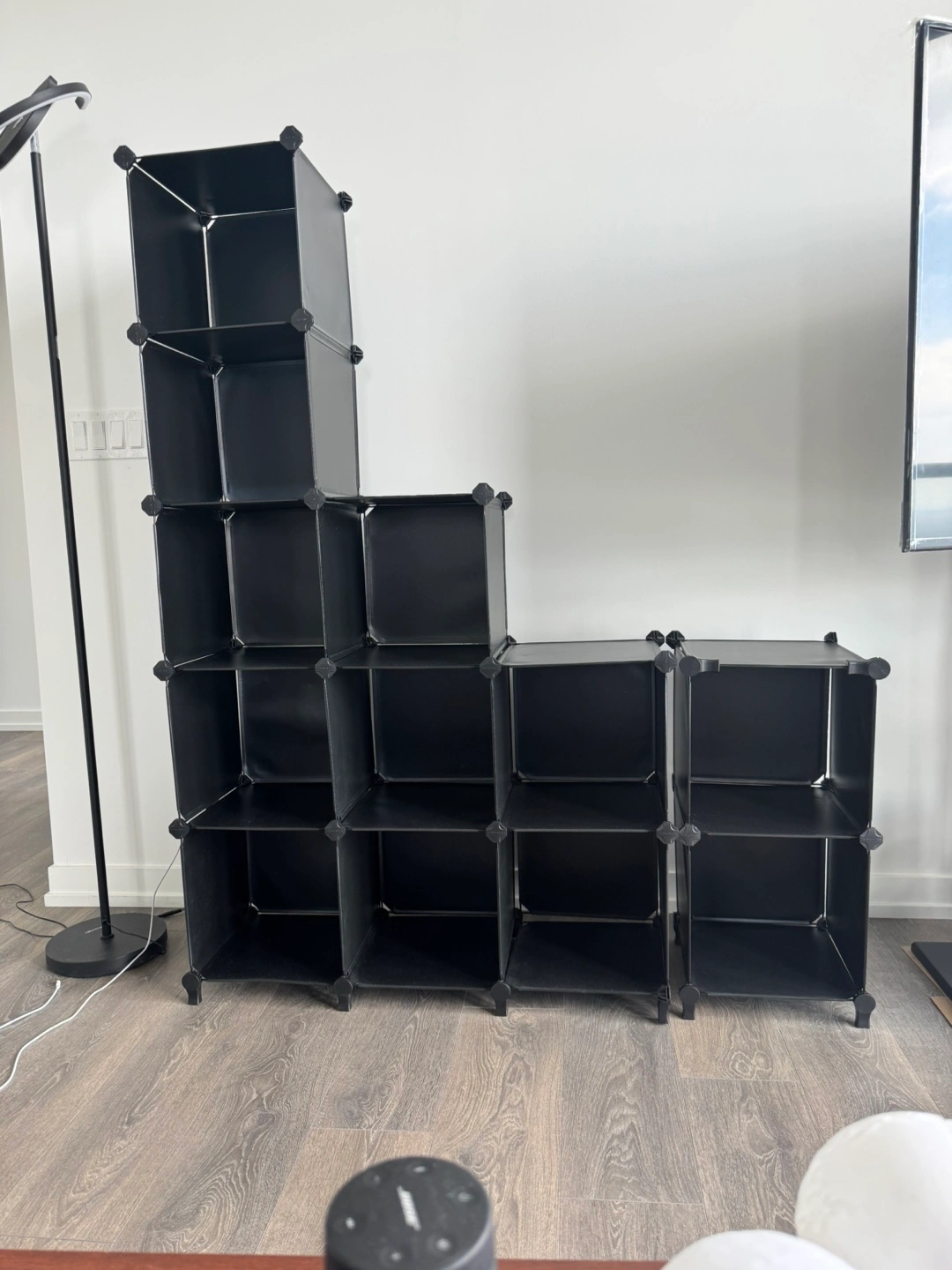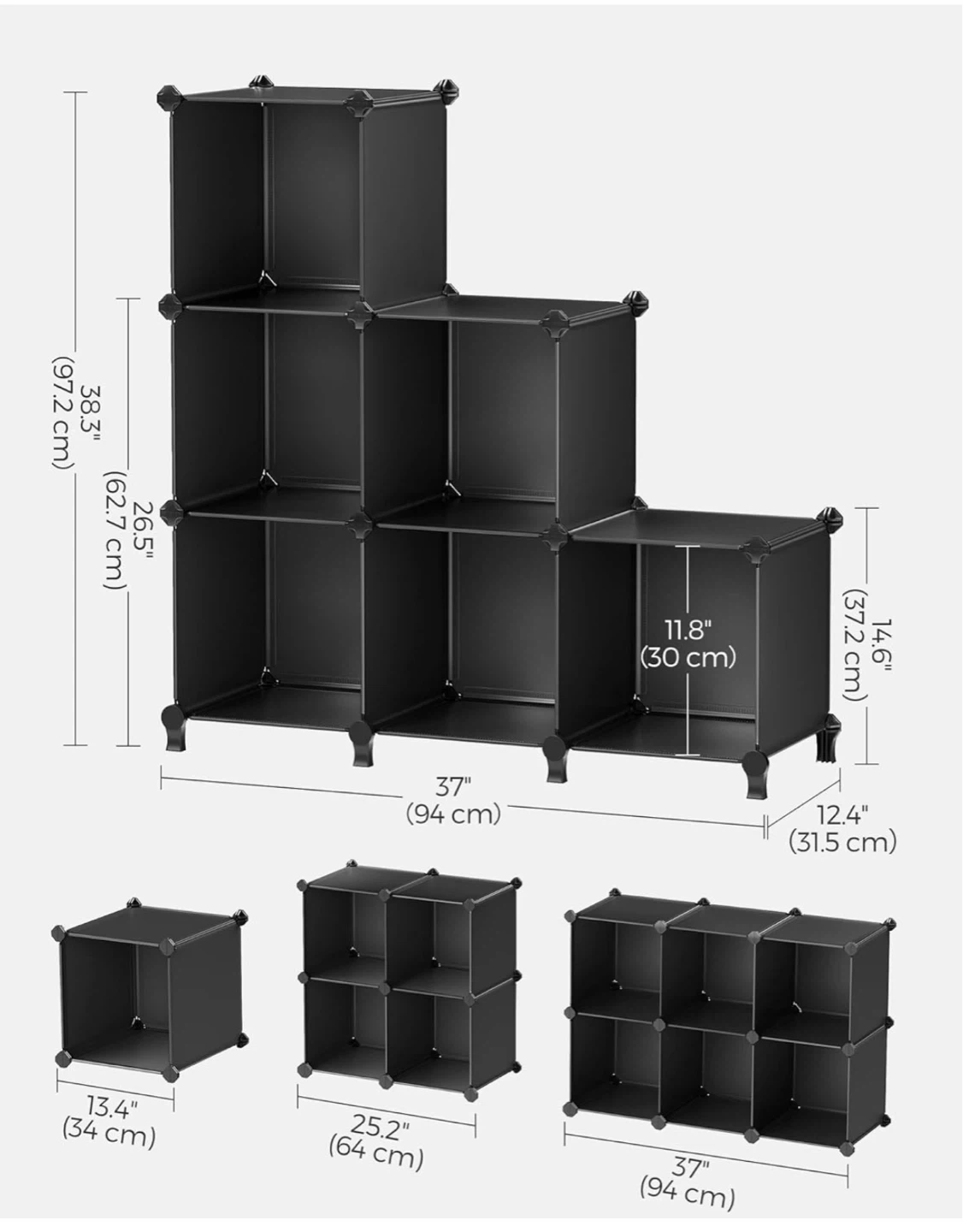 2 sets of cube modular shelving units (12 cubes). Multiple cube compartments. Black plastic construction. Easy assembly and disassembly. Great for organizing various items.