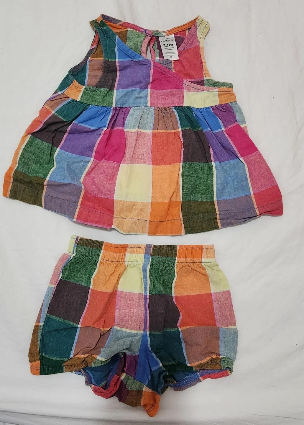 Cute Carter's outfit with a colourful plaid sleeveless dress and matching bloomers. Both pieces are size 12 months. Perfect for warmer weather!