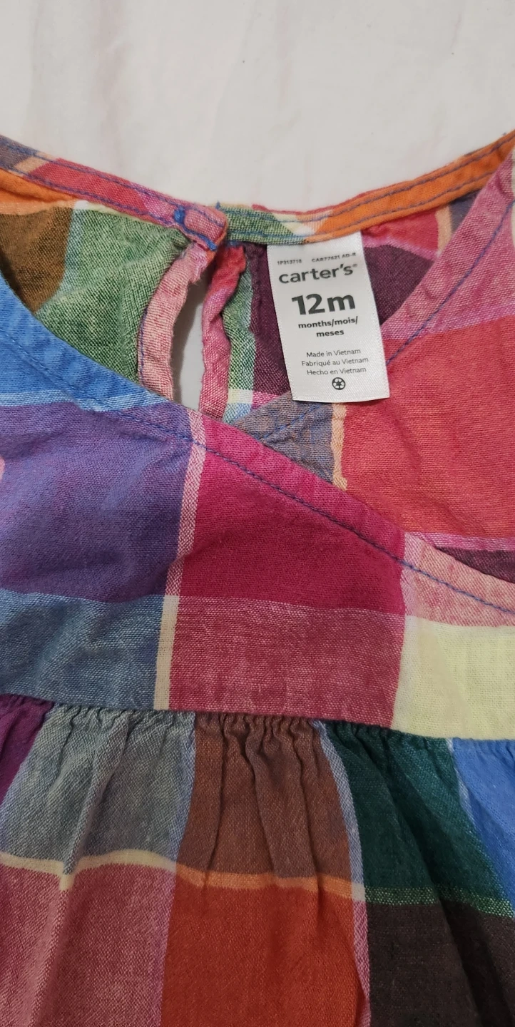 Cute Carter's outfit with a colourful plaid sleeveless dress and matching bloomers. Both pieces are size 12 months. Perfect for warmer weather!