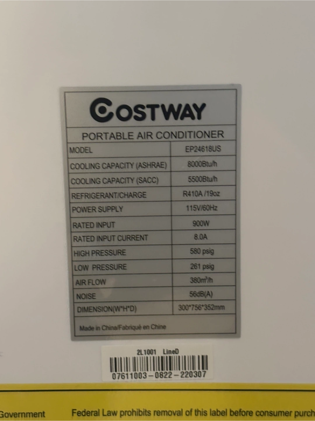 Selling a Costway portable air conditioner, perfect for cooling rooms up to 230 sq ft. Dehumidifying and fanning modes, sleep mode, and time settings. The model number is EP24618US. Dimensions are 300*756*352mm. Get ready for summer!
