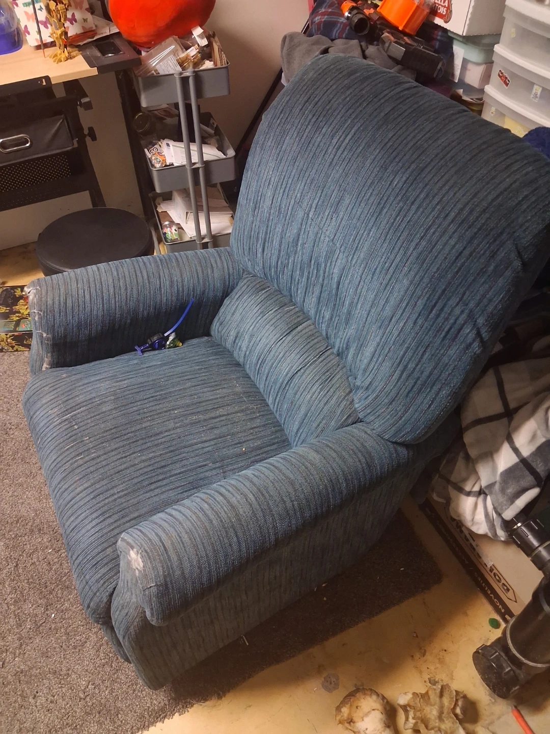 A comfy recliner chair upholstered in blue corduroy fabric. It features a padded back and armrests for extra comfort. The footrest is extendable for more relaxation. Some minor wear is visible on the arms. Come sit see if you like it