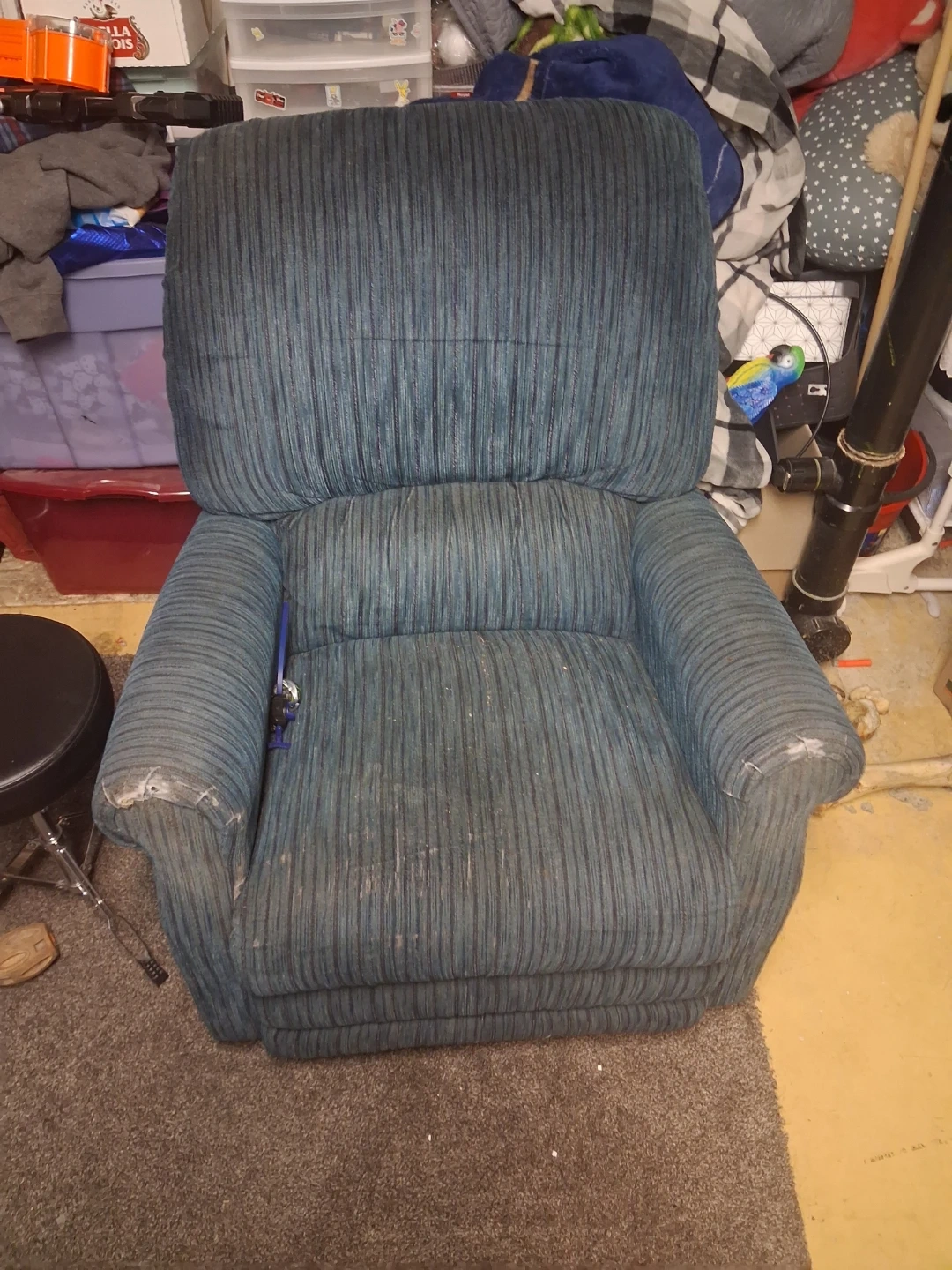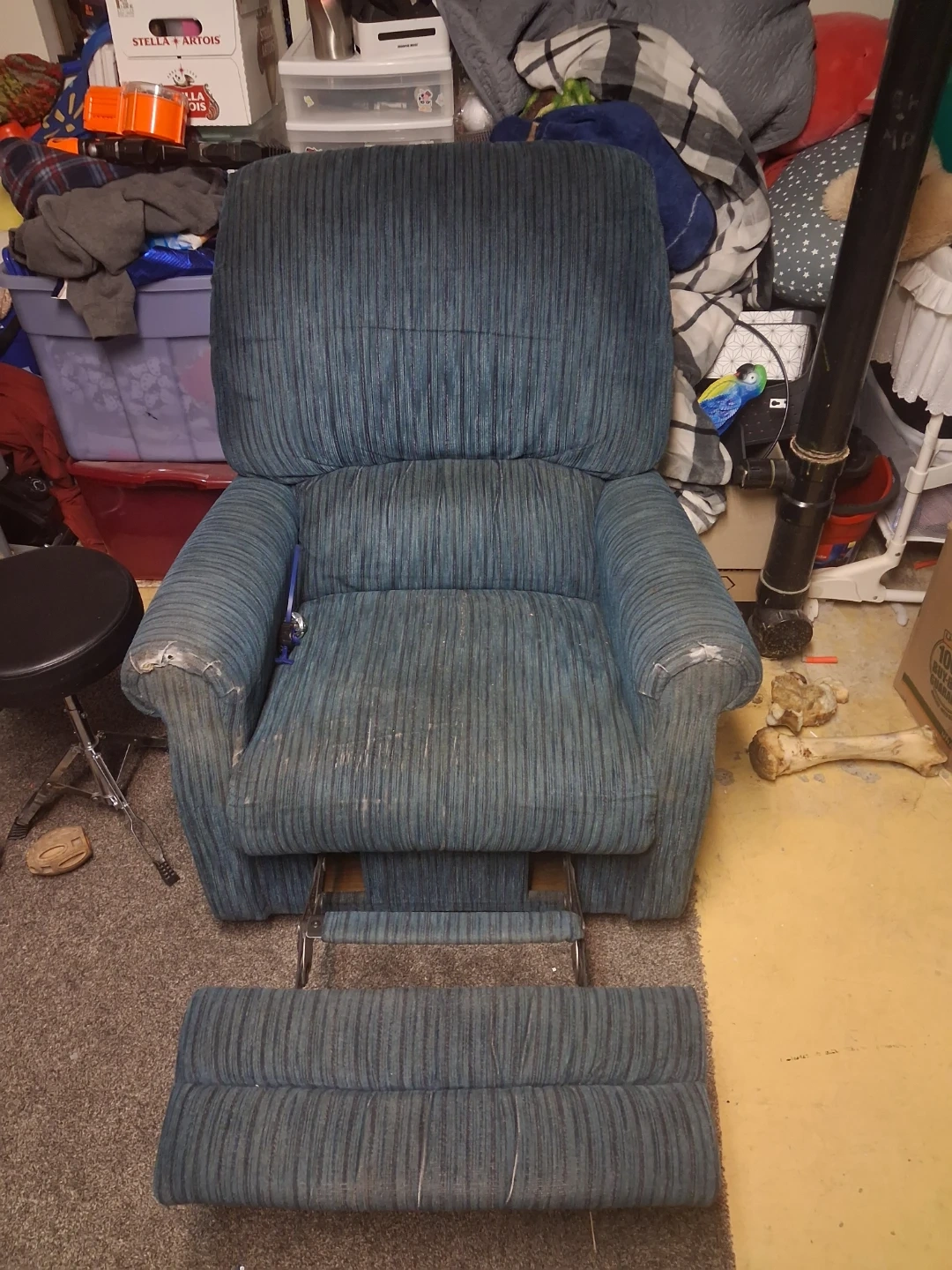 A comfy recliner chair upholstered in blue corduroy fabric. It features a padded back and armrests for extra comfort. The footrest is extendable for more relaxation. Some minor wear is visible on the arms. Come sit see if you like it
