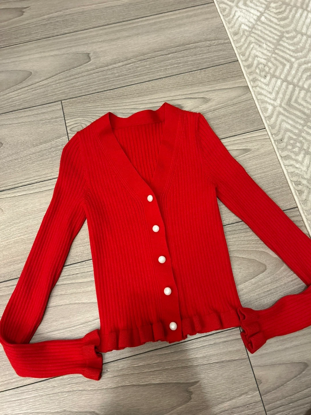 Here's a cute red cardigan with white buttons! It's in great condition and would be a stylish addition to any wardrobe