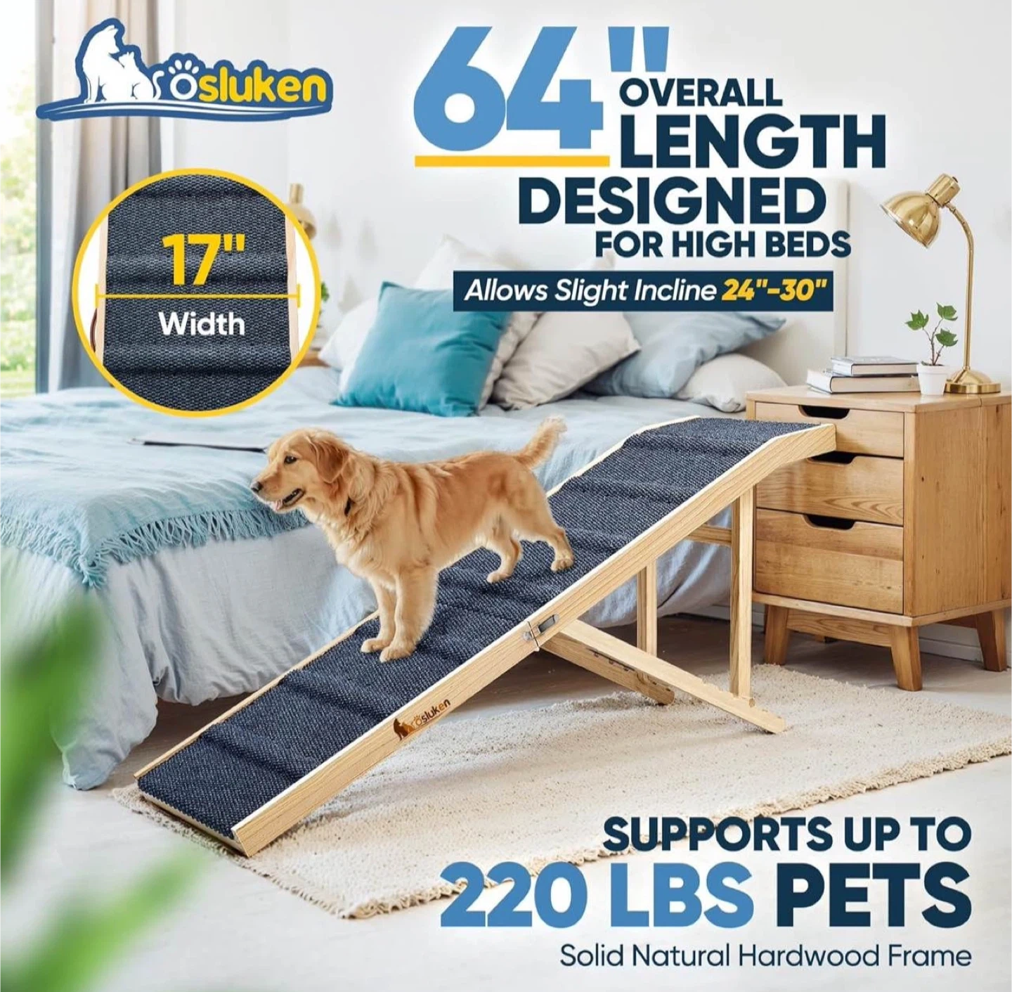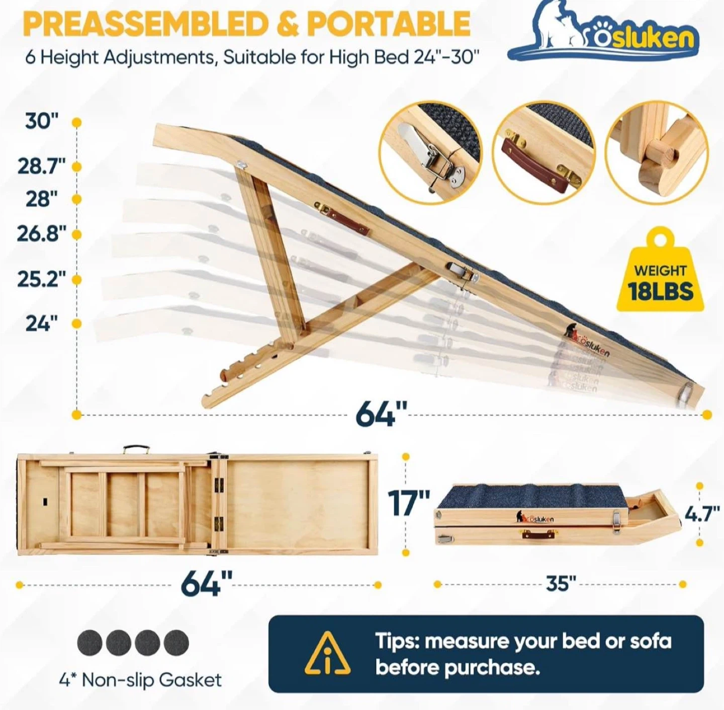 94Tsukiko Dog Ramp - Brand new in box 64" Long Foldable Pet Ramp High Traction with Platform 6 Adjustable Heights 24" to 30" Up to 220LBS, Wood See pics for measurements