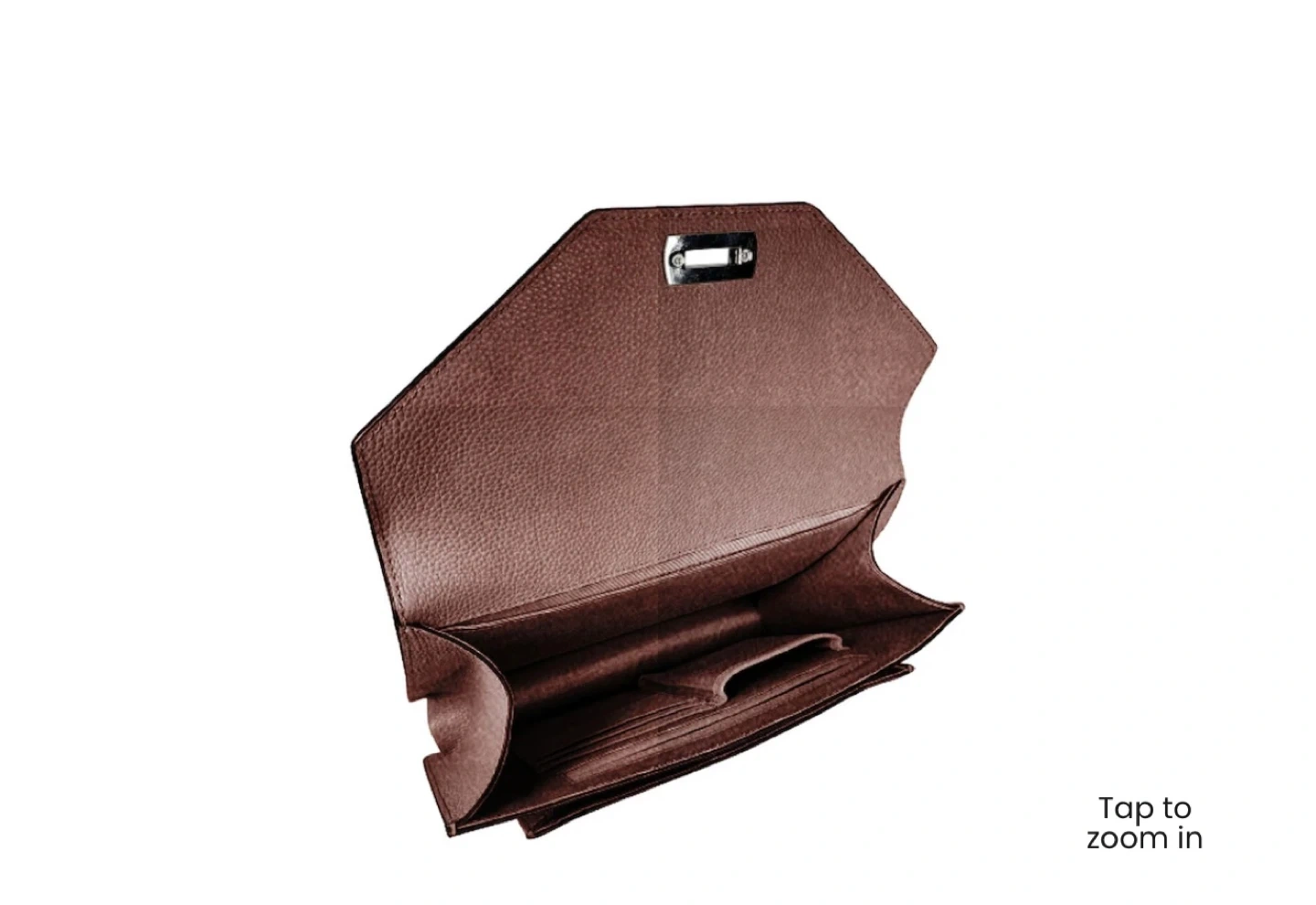 This is a stylish silver clutch bag designed to hold a tablet. It features a secure clasp closure and a convenient shoulder strap. The interior has several compartments for organization.