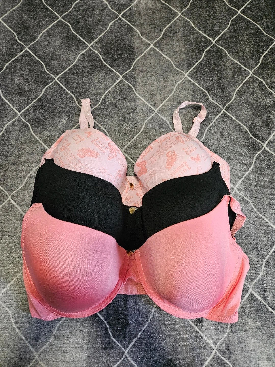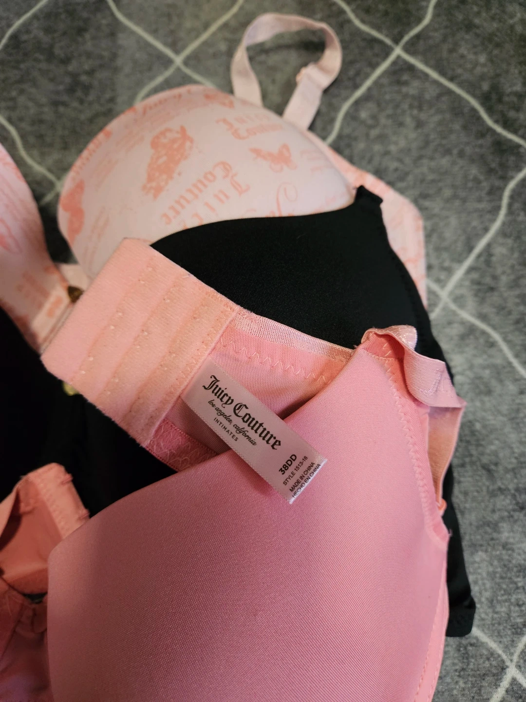 Three Juicy Couture bras in black and pink. Size 38DD. Features adjustable straps and underwire for support. This set offers a comfortable and stylish option for everyday wear.