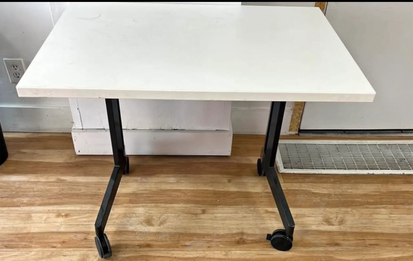 This is a white table with black metal legs and wheels. It's convenient for various uses around the home or office. The table has a flat, smooth surface.
