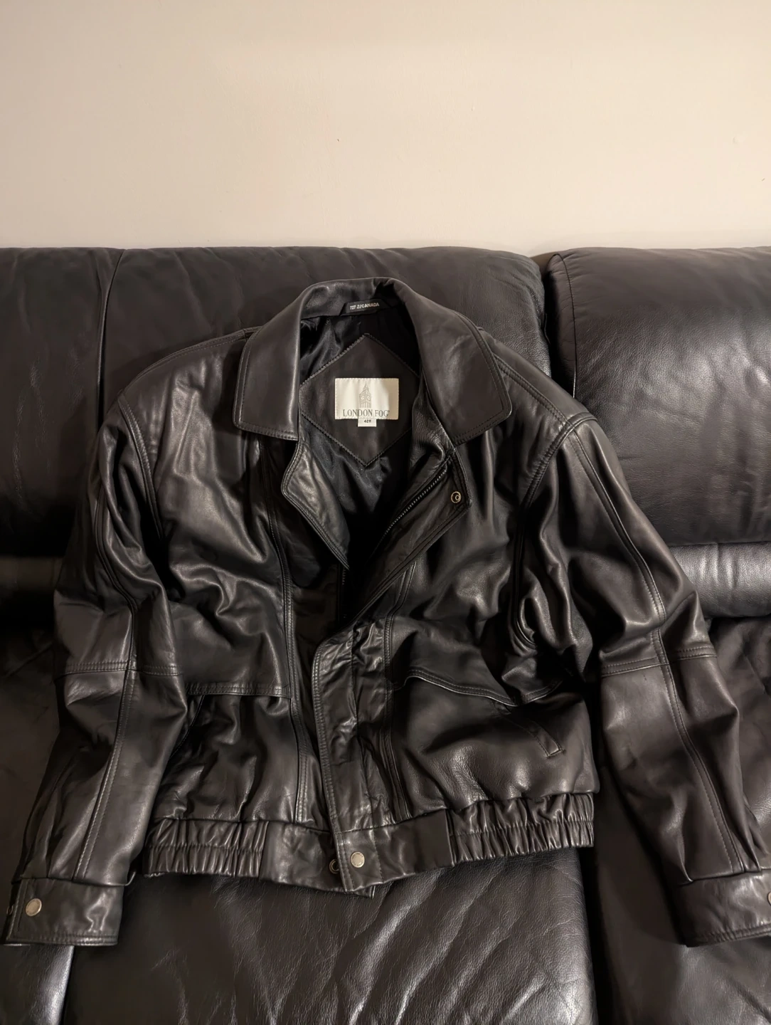 Classic black genuine leather jacket by London Fog, known for timeless outerwear and quality craftsmanship. This jacket features a sleek, versatile design that works for both casual and dressier looks.