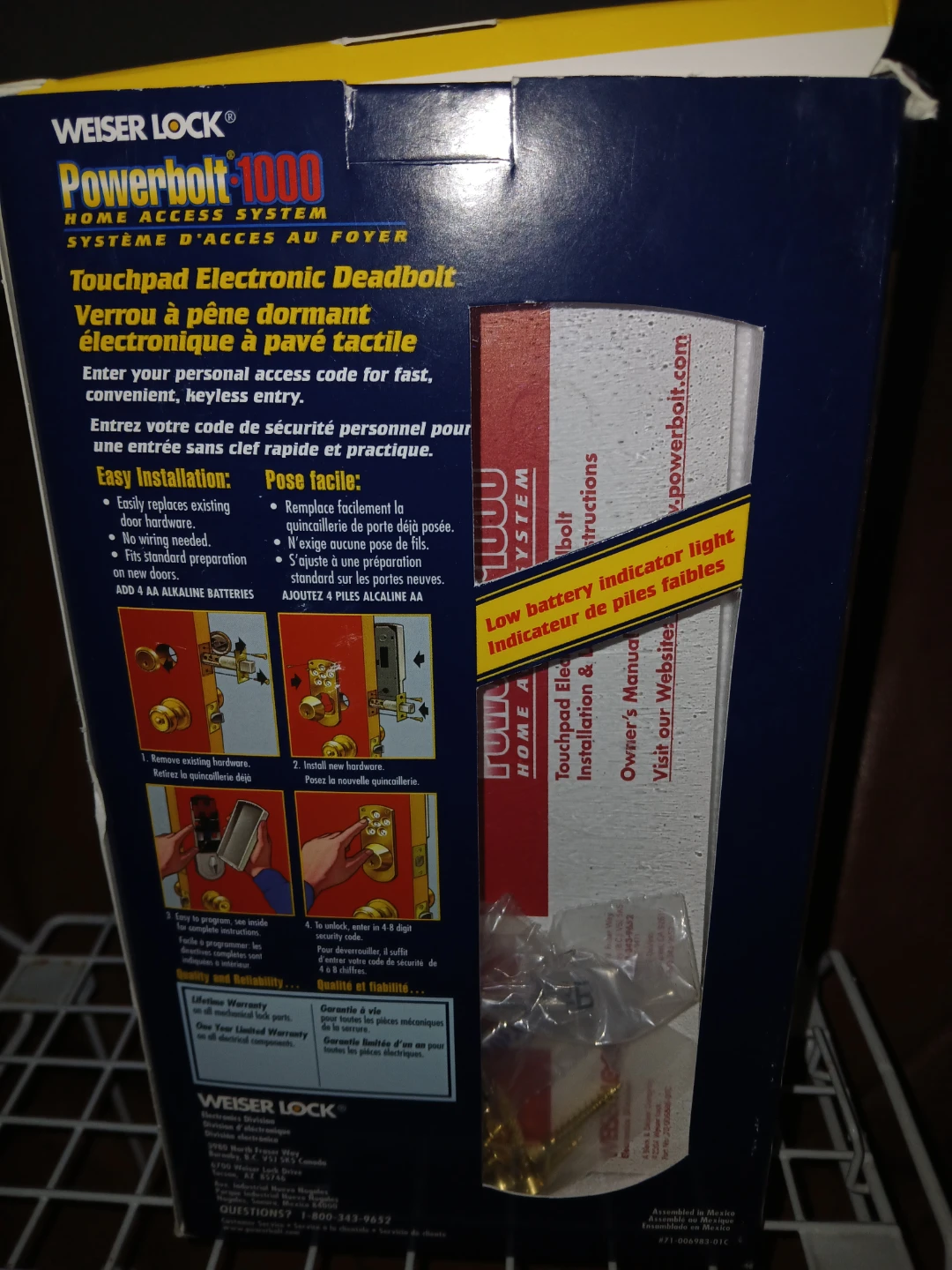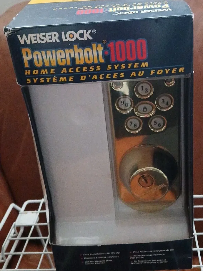 This is a Weiser Lock Powerbolt 1000, a touchpad electronic deadbolt home access system. It's designed for easy installation with no wiring required and works with existing hardware. It requires 4 AA batteries for operation.