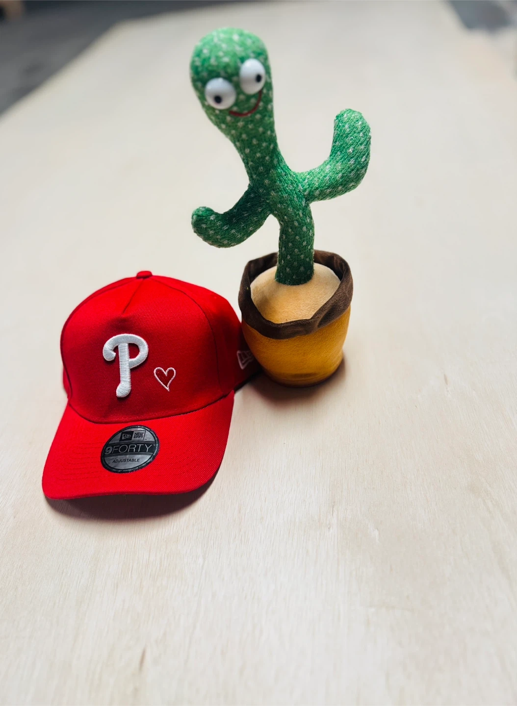 This is a red New Era 9FORTY adjustable baseball cap for the Philadelphia Phillies. It features the team's 'P' logo and a small heart embroidery. The cap is in excellent condition and ready for a new owner!