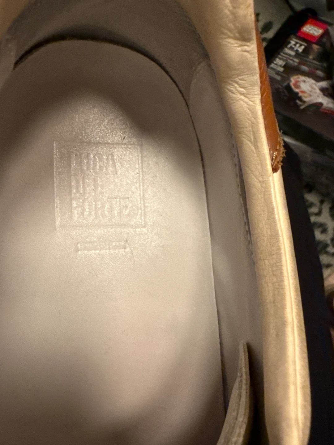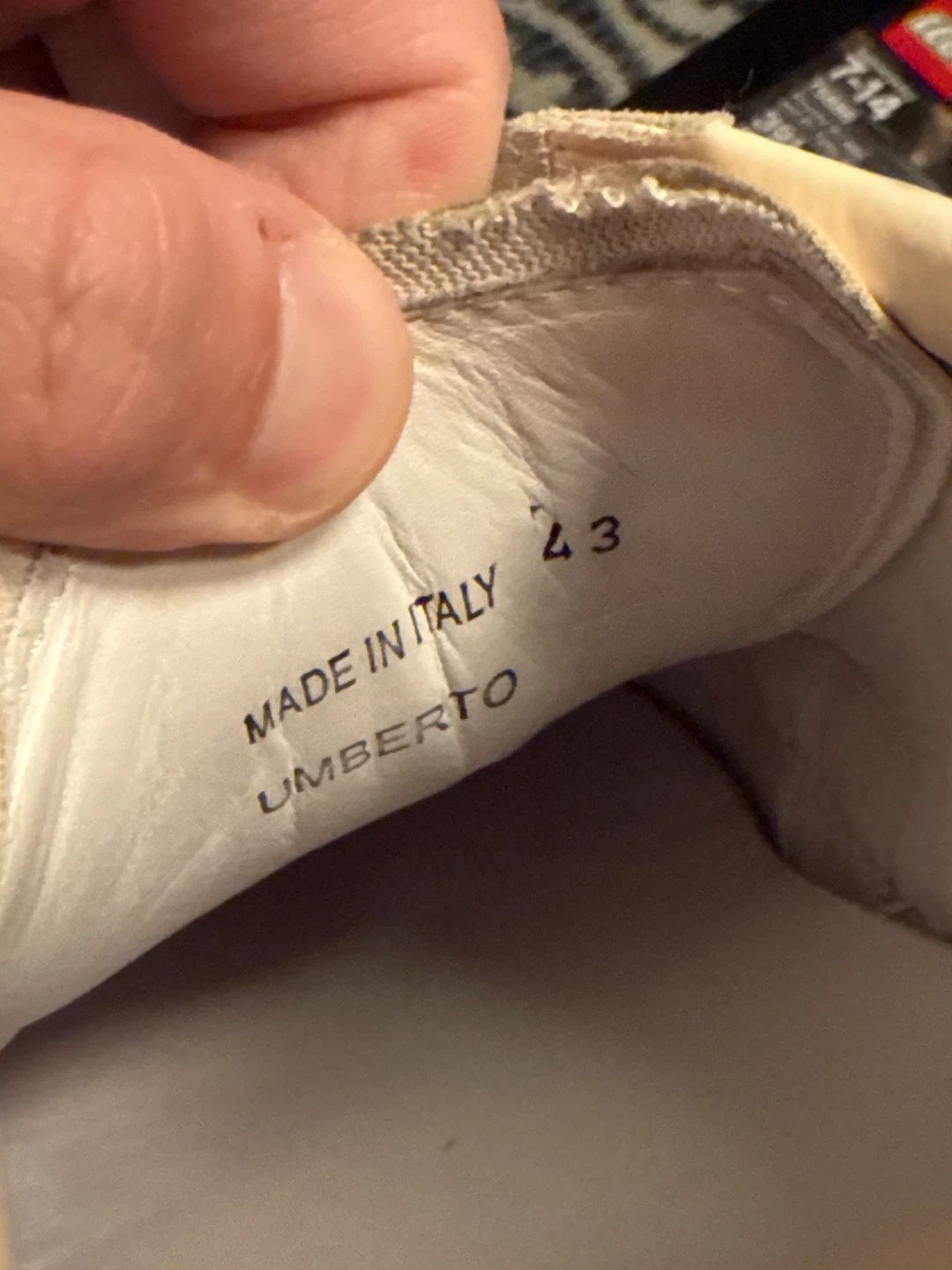 These stylish Luca Del Forte leather sneakers are made in Italy. They feature a light tan leather upper with brown leather accents on the heel. Size 43.