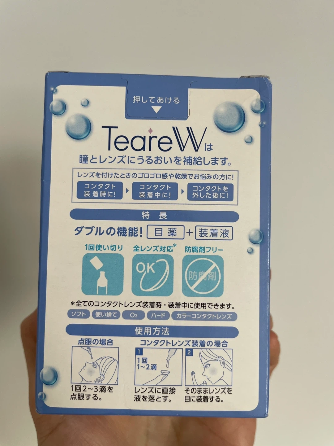 TeareW eye drops help rehydrate your eyes and lenses. These drops are preservative-free and suitable for all types of contact lenses. Expiry date is April 2026.