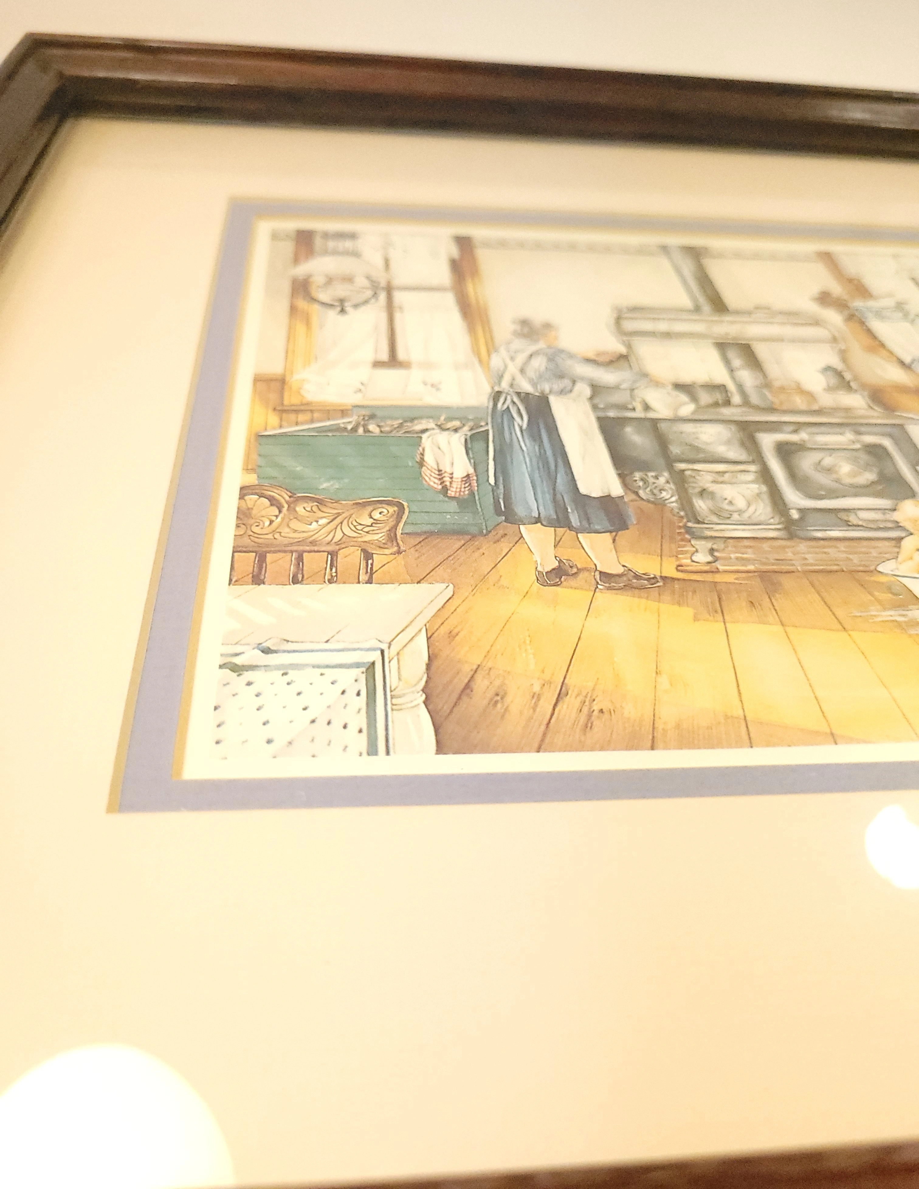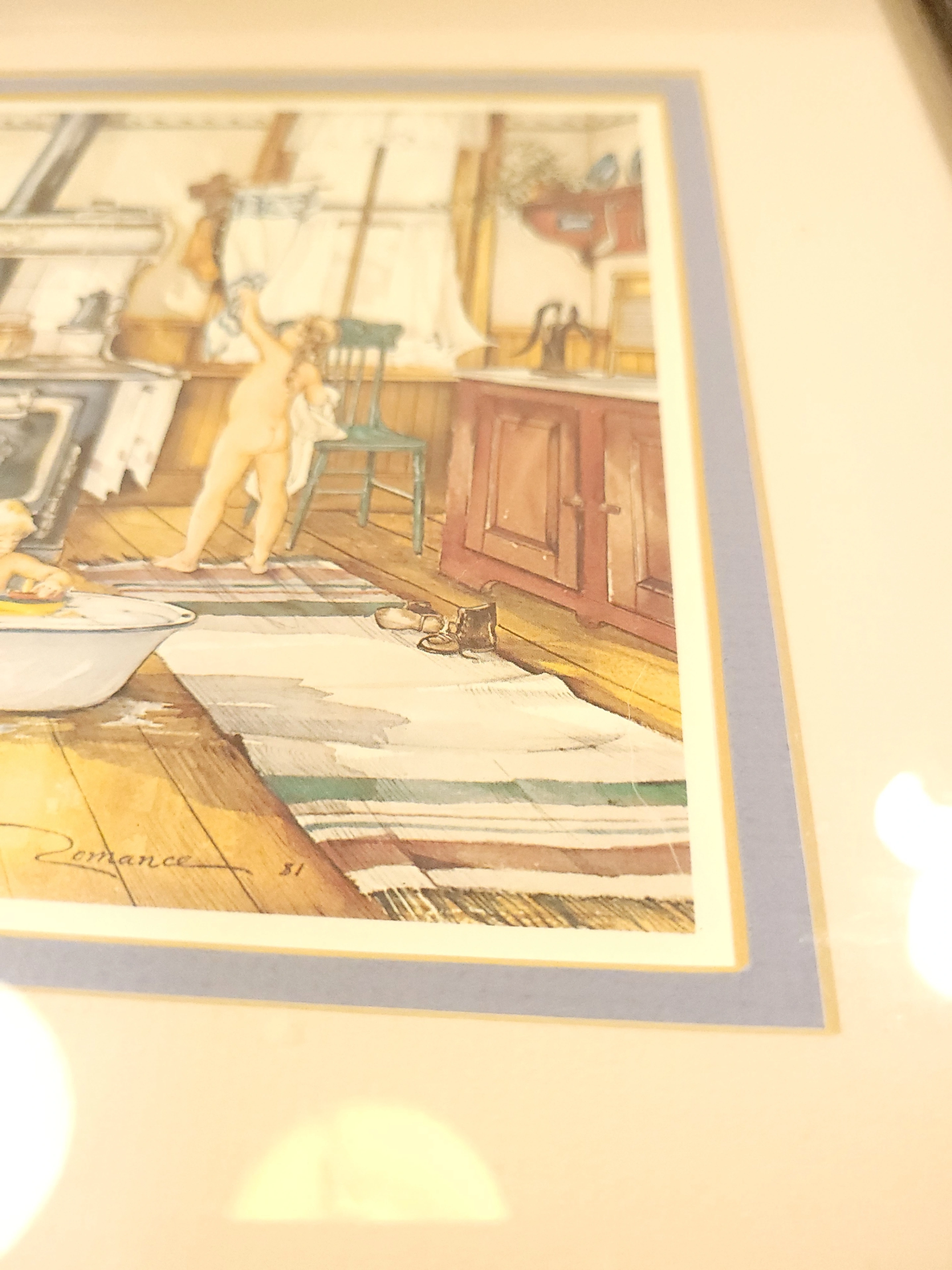 This is a charming vintage framed piece featuring the iconic "Kitchen Bath" scene by Trisha Romance. This particular item is a high-quality vintage magazine clipping from the 1980s, professionally matted and framed to give it the appearance of a gallery print.