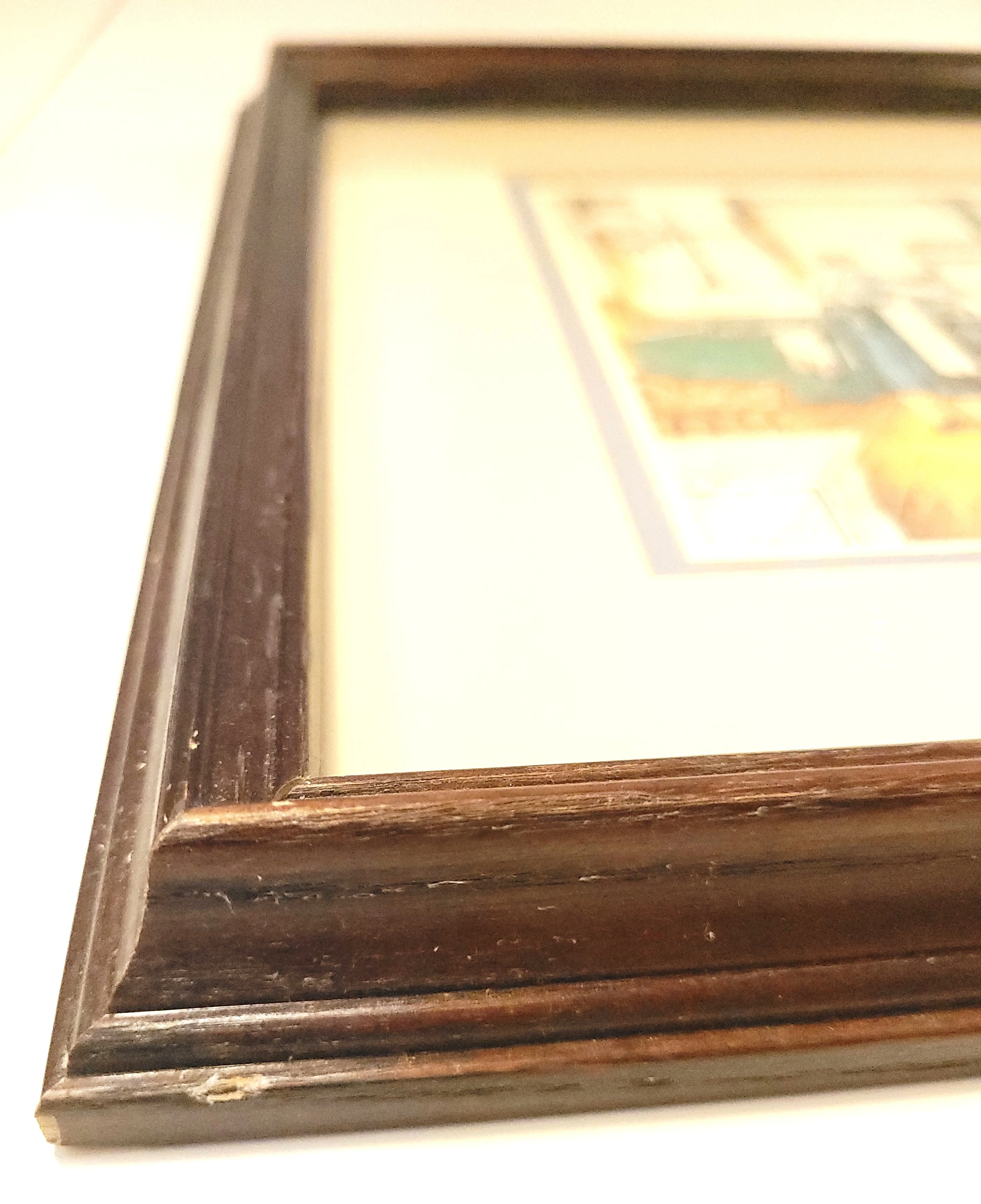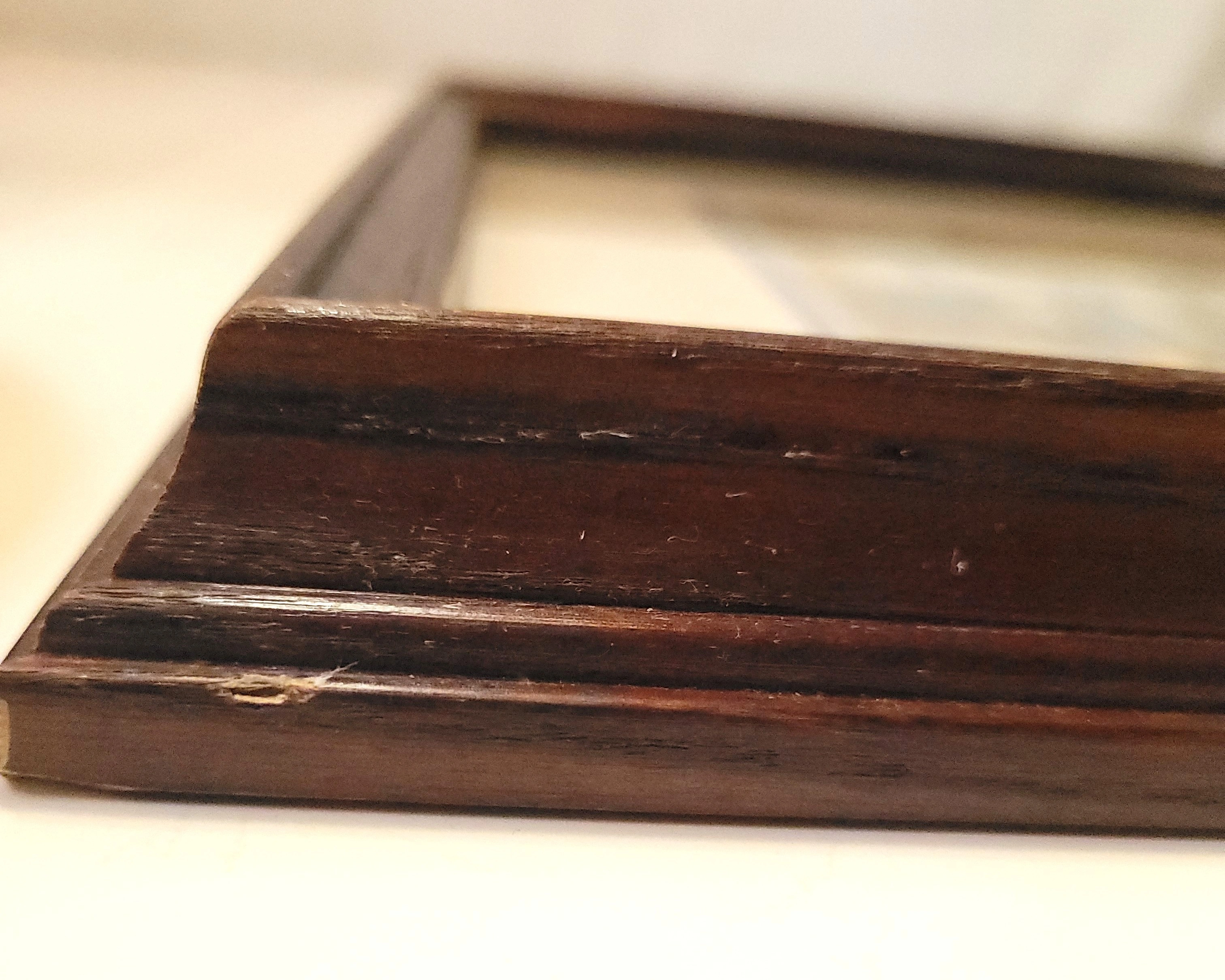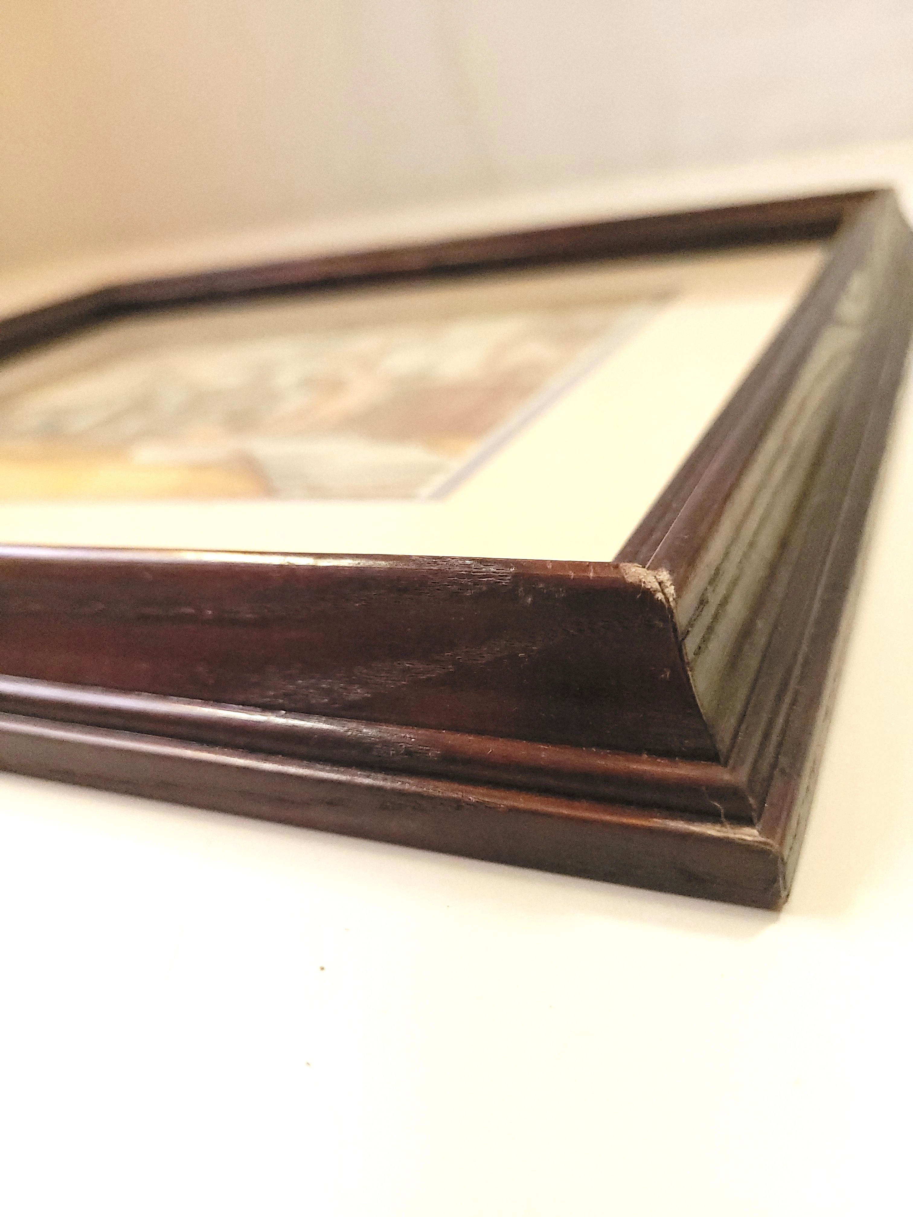 The frame is in vintage "as-found" condition with some visible scuffs and chips on the wood edges, lending it a rustic, lived-in farmhouse feel. The image itself is bright and clear.