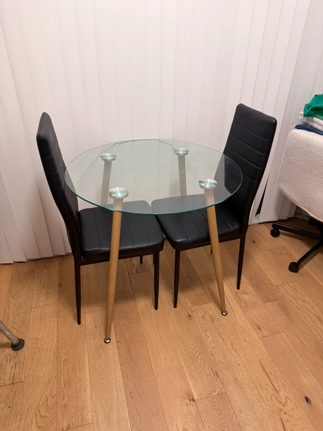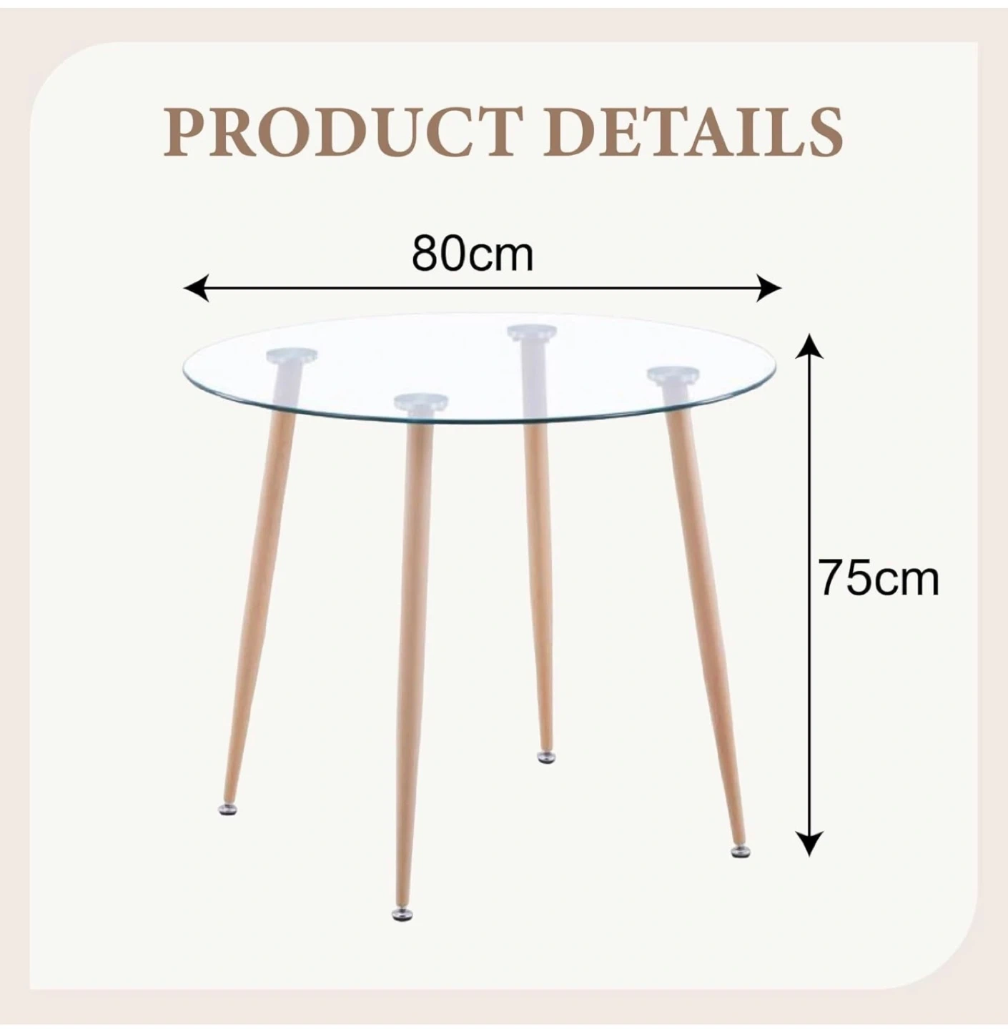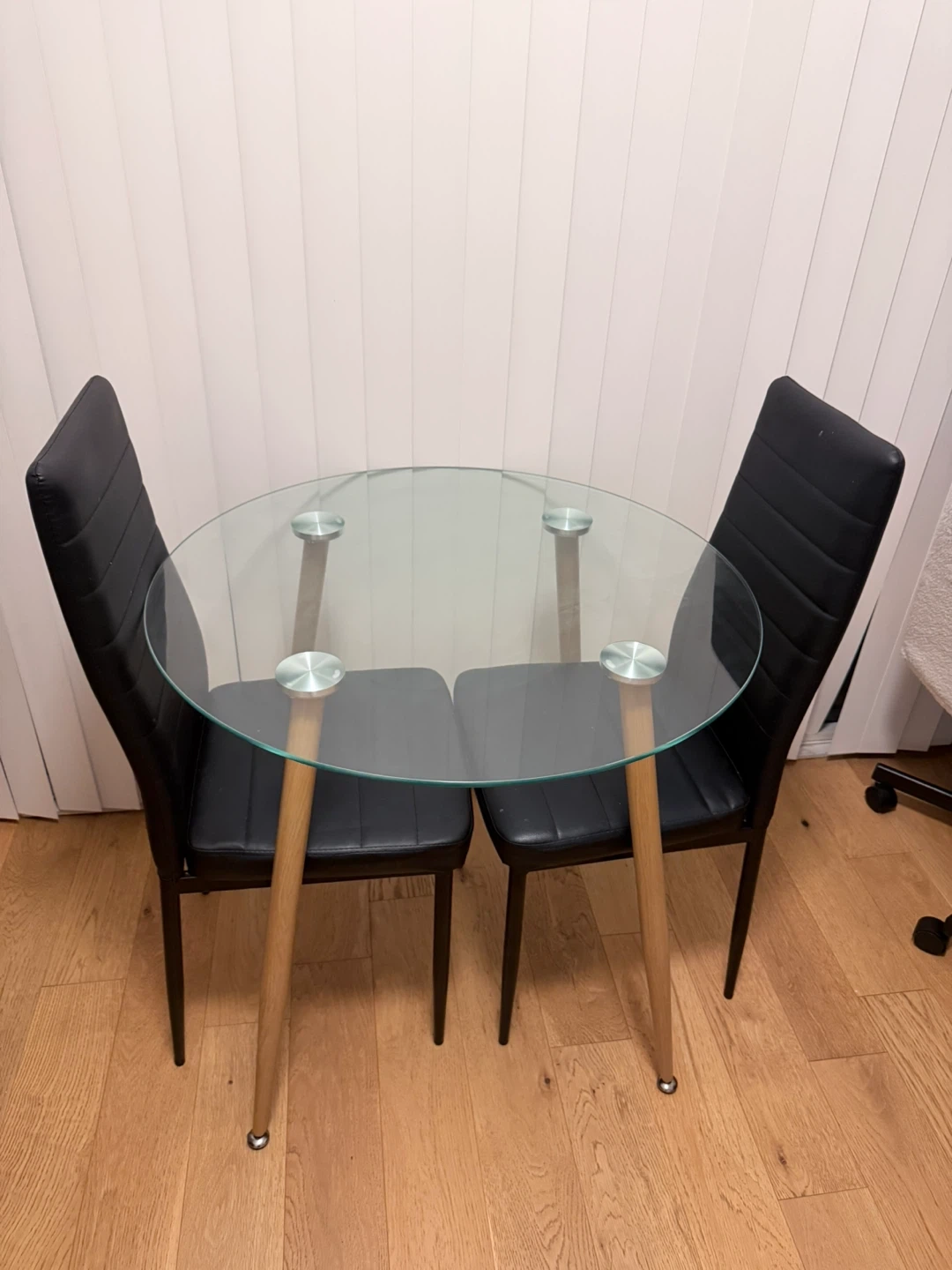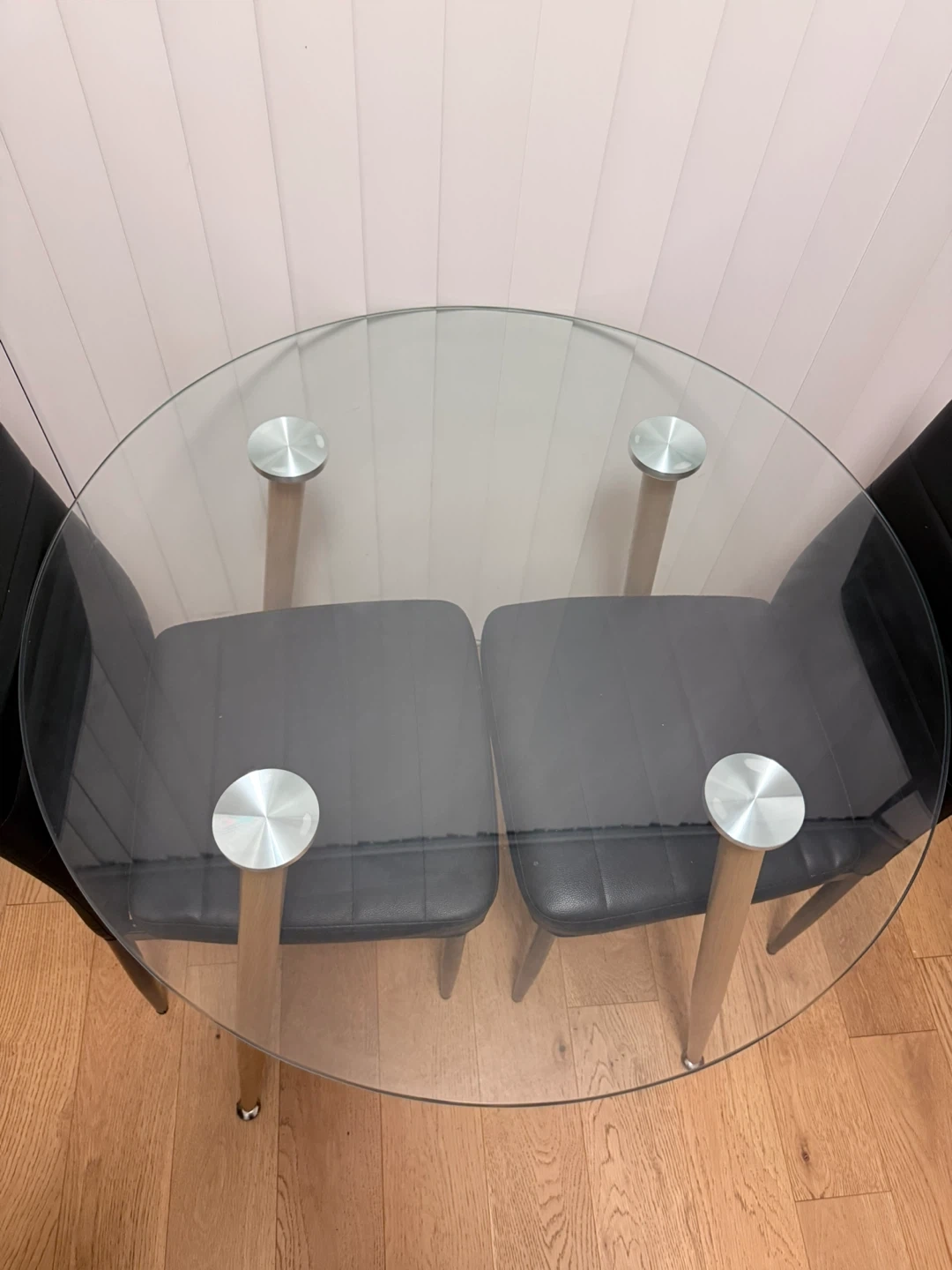 Selling a round dining table with a glass top and two to four chairs. The table's dimensions are 80cm in diameter and 75cm in height. It's a stylish set that would look great in a smaller space!