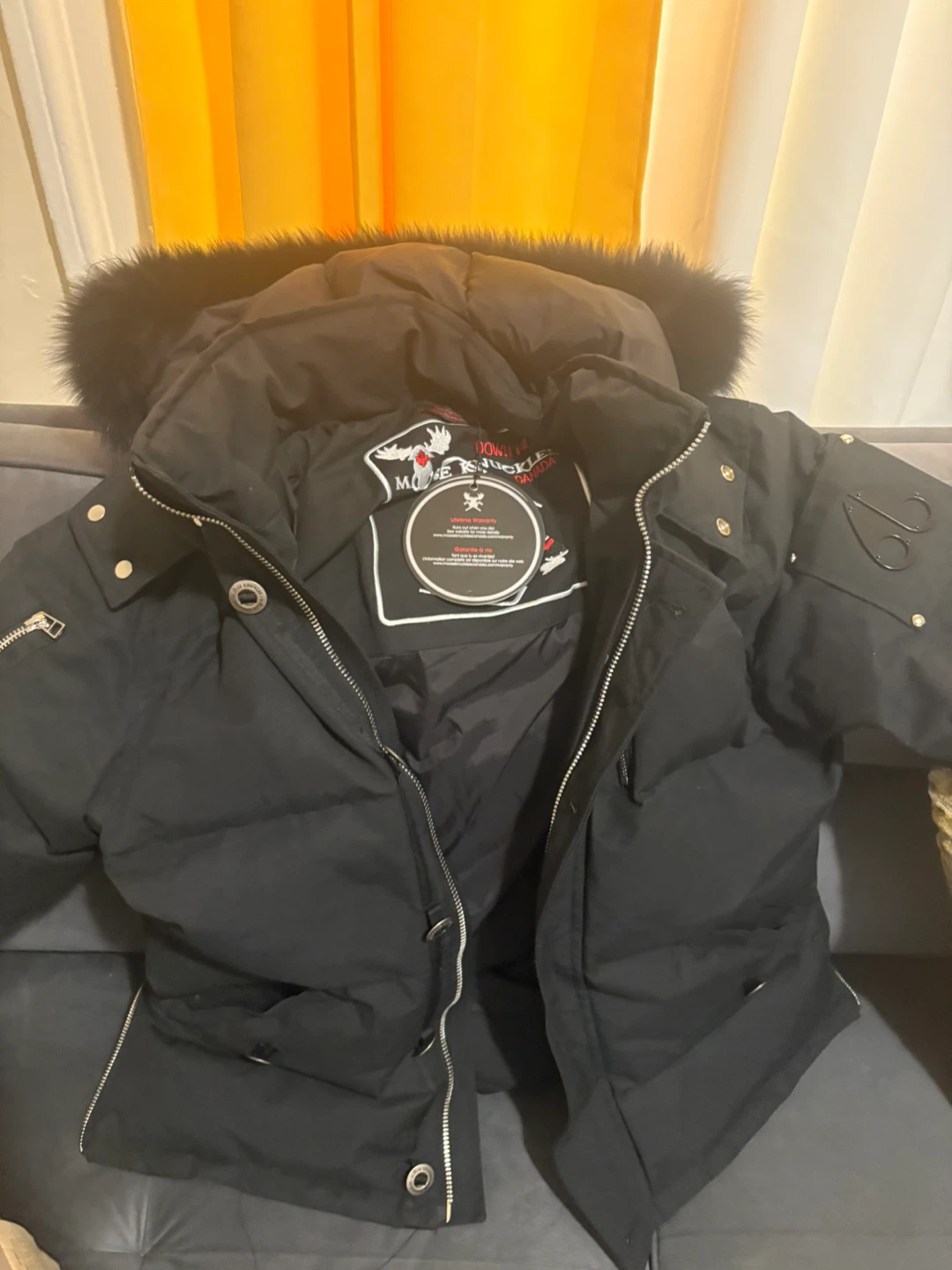 Selling a Moose Knuckles black down padded bomber jacket. It's in great condition and ready to keep you warm this winter! The jacket features a fur-trimmed hood and the brand's signature metal logo on the sleeve. Perfect for staying stylish and cozy in cold weather