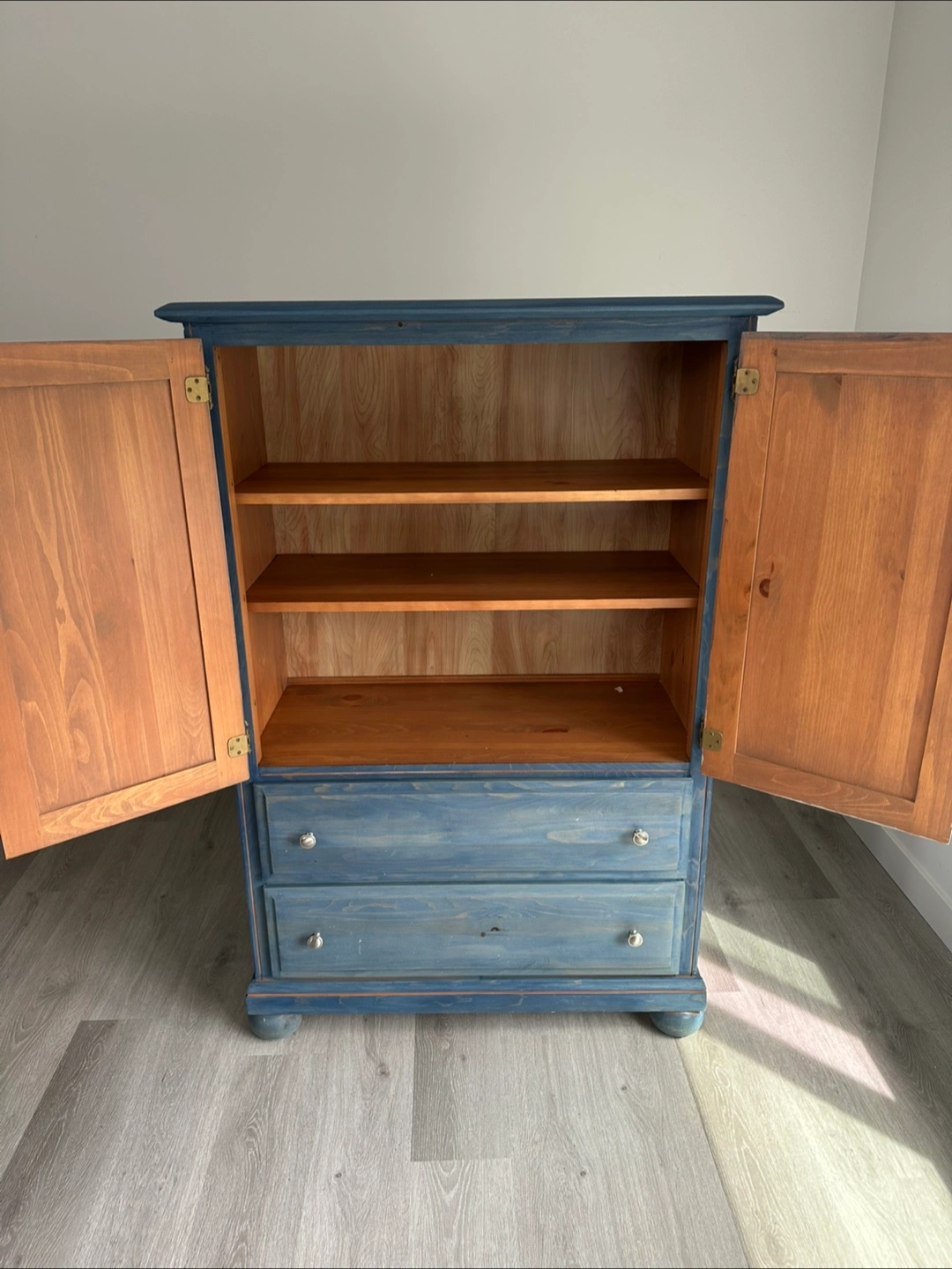 Keep this armoire blue, or refinish it to the colour of your choice. The original colour can be seen inside the doors. It includes both shelving and drawers for versatile storage options. It’s in great shape with no damage. Can deliver to Calgary.