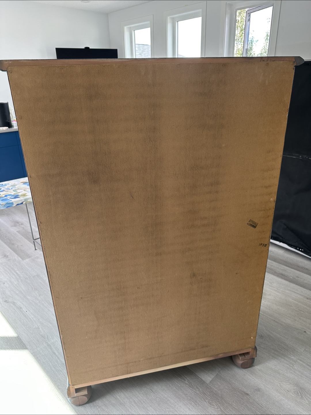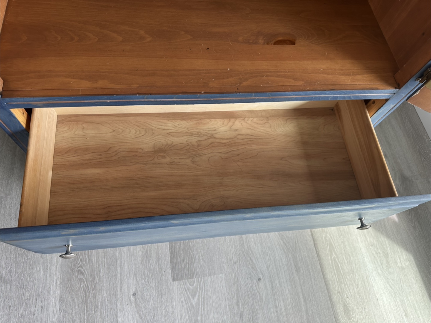 Keep this armoire blue, or refinish it to the colour of your choice. The original colour can be seen inside the doors. It includes both shelving and drawers for versatile storage options. It’s in great shape with no damage. Can deliver to Calgary.
